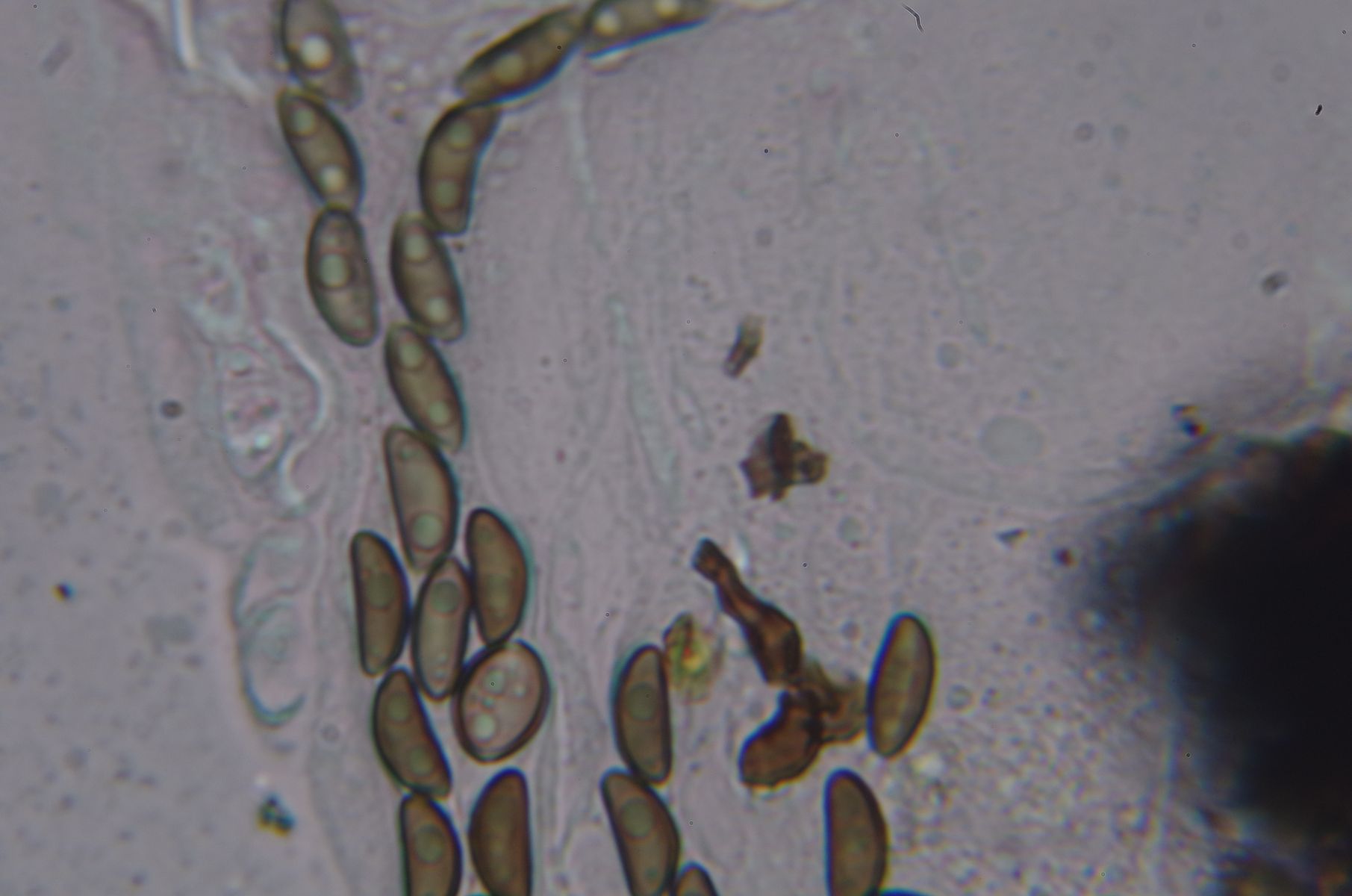 Das hat mich erst mal an Bertia moriformis oder Lasiosphaeria erinnert, allerdings waren die Sporen dafür deutlich zu klein (9-10 x 3,5-5,5). Die Asci waren ca. 8-sporig und einreihig (also damit meine ich, dass nicht mehrere Sporen nebeneinander waren.