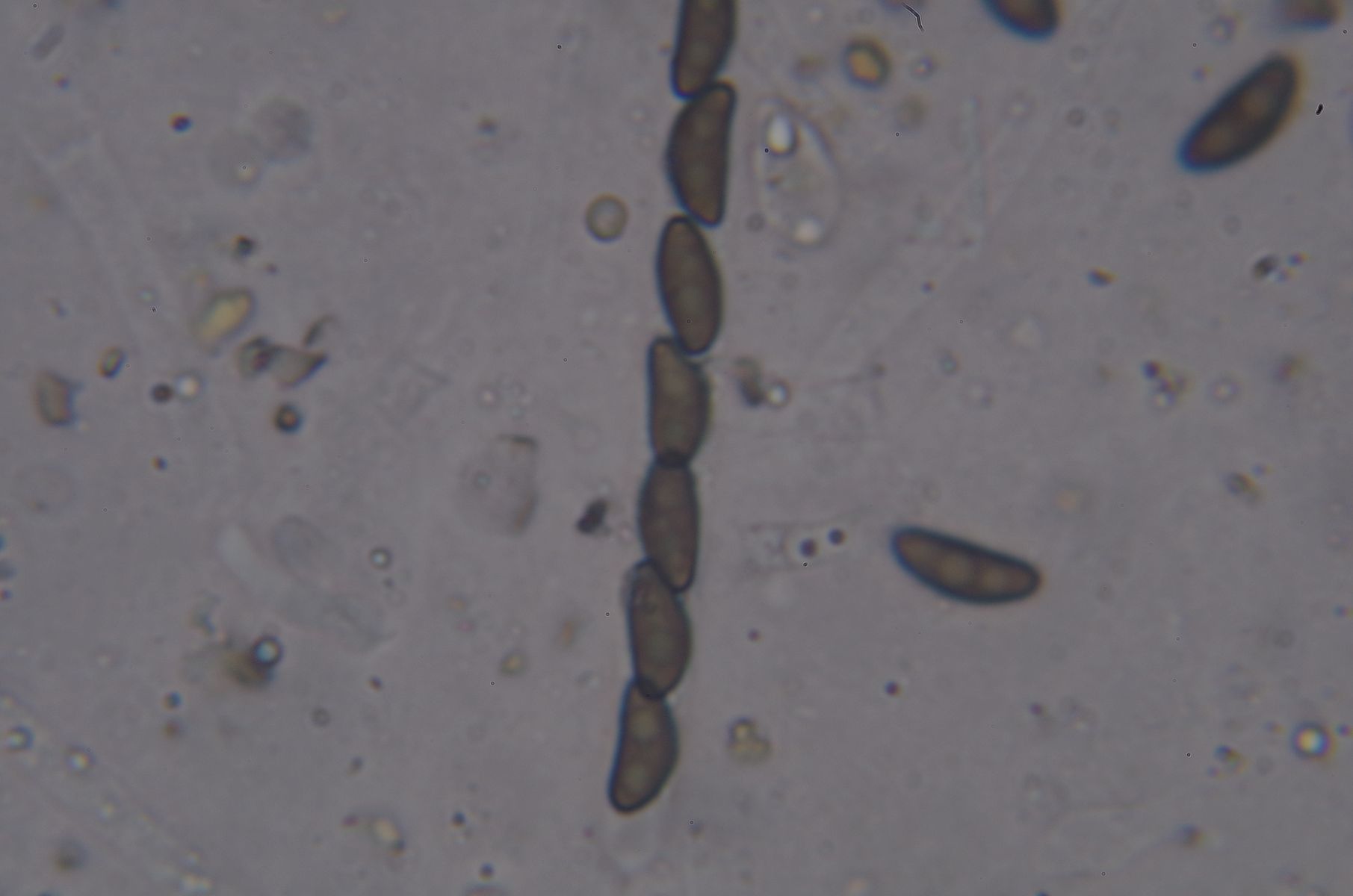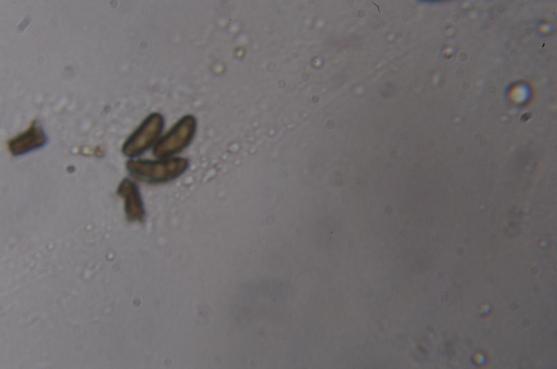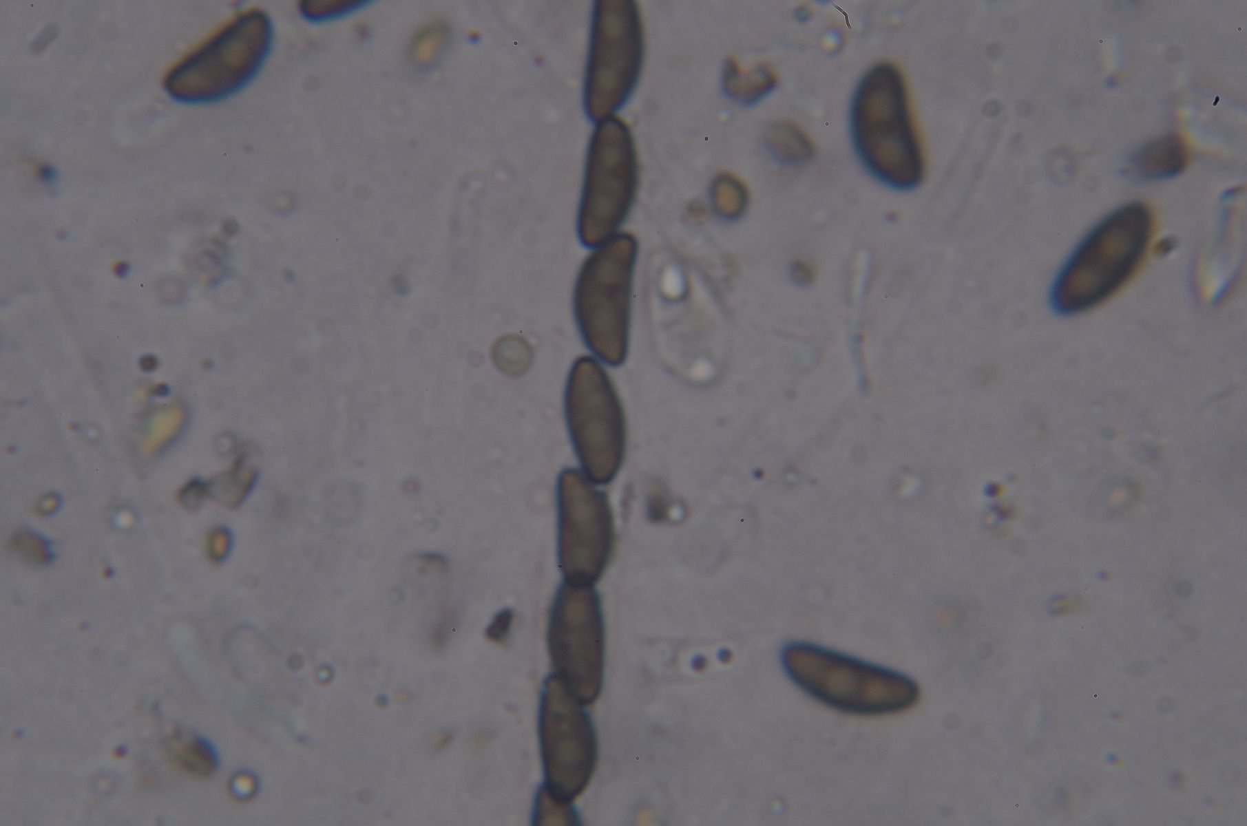 Das hat mich erst mal an Bertia moriformis oder Lasiosphaeria erinnert, allerdings waren die Sporen dafür deutlich zu klein (9-10 x 3,5-5,5). Die Asci waren ca. 8-sporig und einreihig (also damit meine ich, dass nicht mehrere Sporen nebeneinander waren.