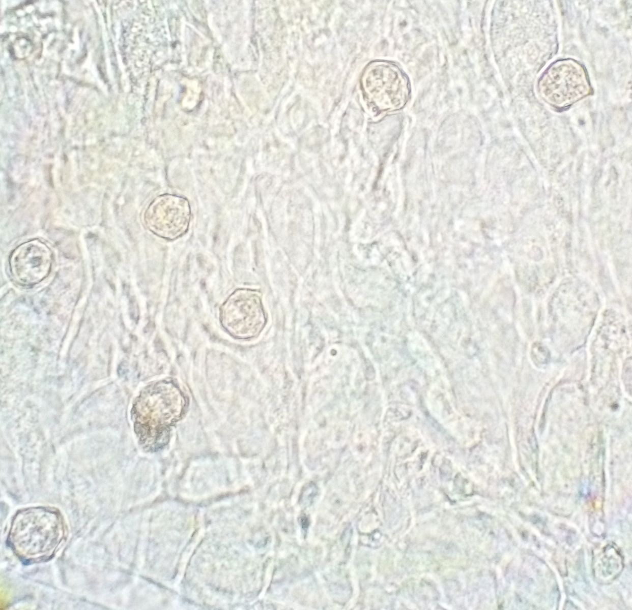 Lamelle. Die Sporen sind +/- 6-eckig, 8-10 * 7-9 µm, Q ~ 1-1,3. Schnallen sind mir nirgends aufgefallen.