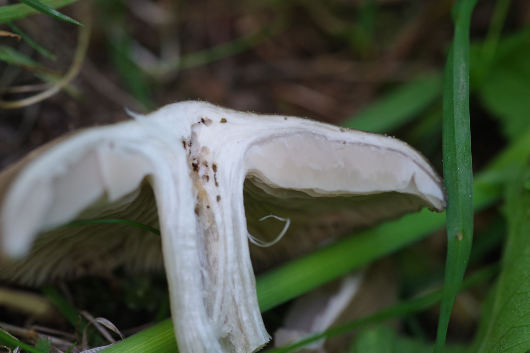 Wenn ich mit diesem Thread vergleiche Entoloma? so sieht hier eigentlich alles passend aus für den Schildrötling. In meinem Schlüssel komme ich aber nur zu clypeatum, wenn ich eine Farbe von "weiß, gelblich, elfenbein" annehme, statt "grau, braun", dieser Schlüssel würde mich sonst zu E. aprile führen, der aber vom Biotop her unpassend ist.