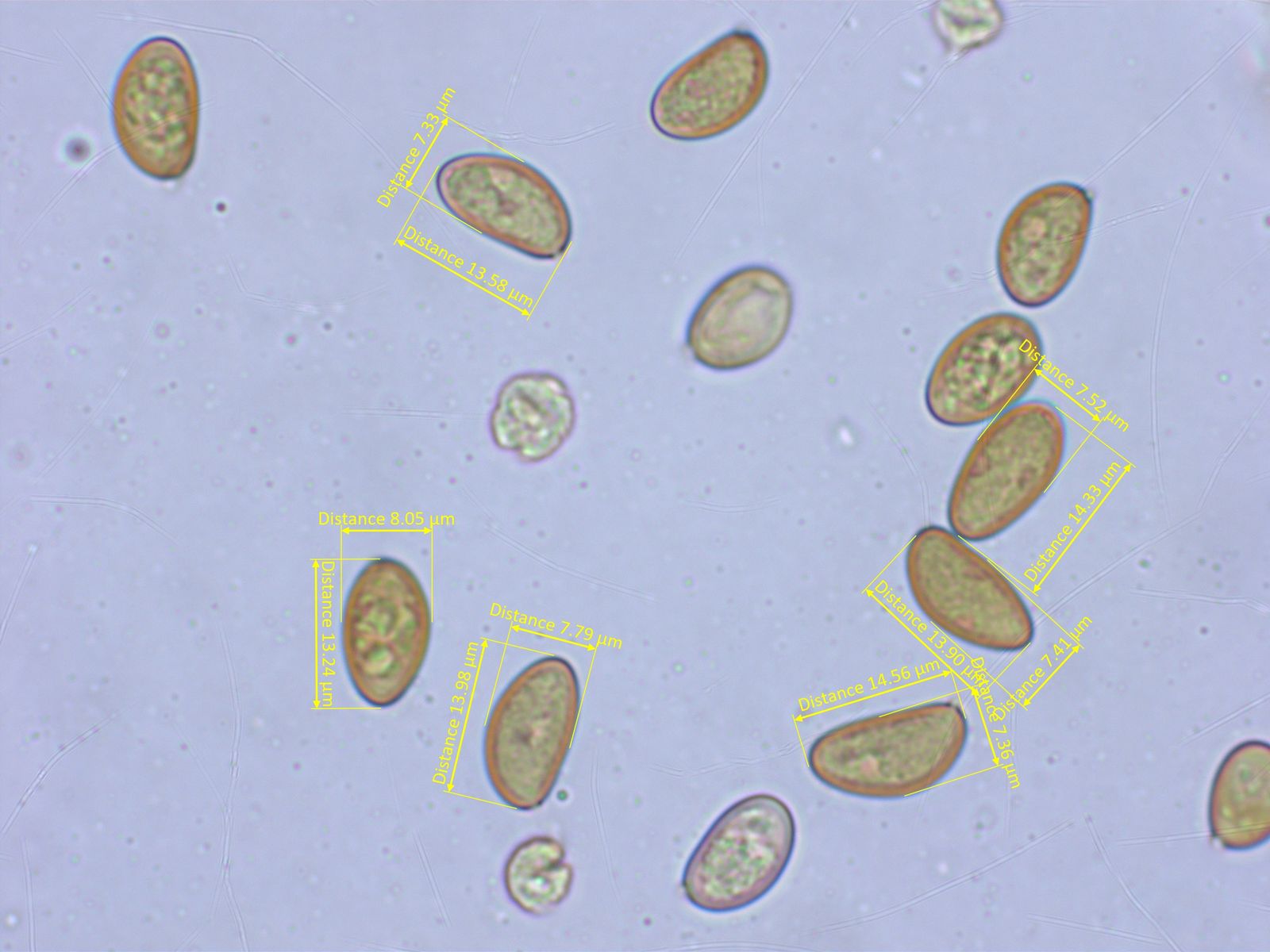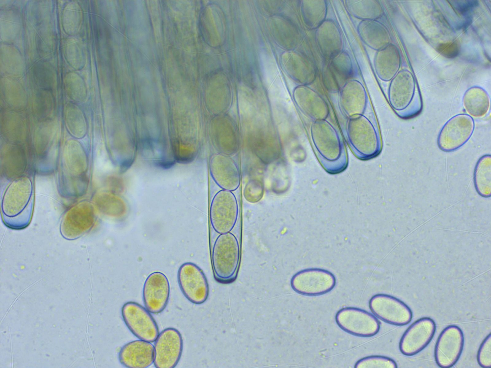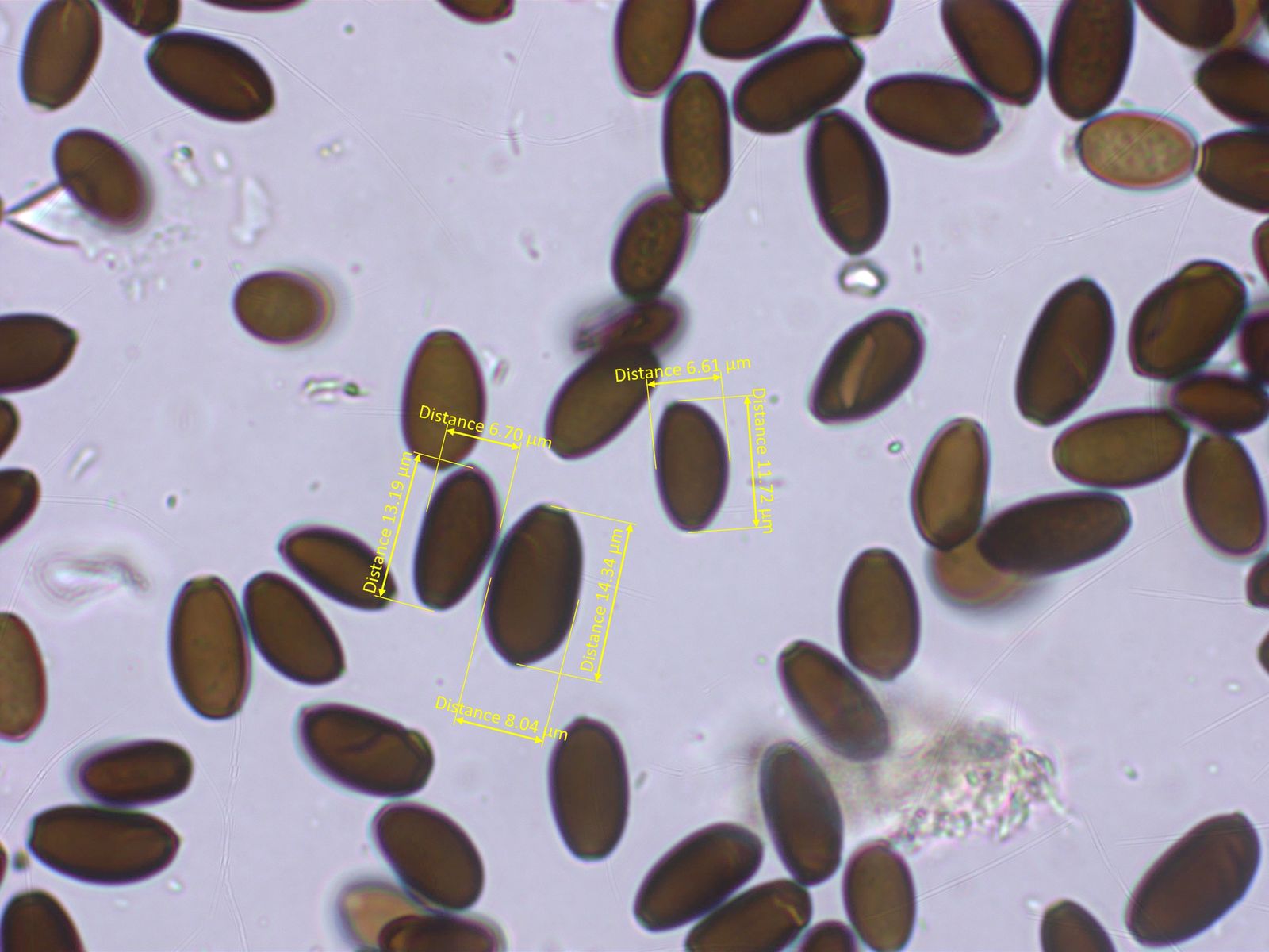 Die Sporen sind recht gross. Ich habe noch nicht brav nach Schulbuch ganz viele gemessen. Etwa 13.2-14.6 x 7.3-8.1 µm.