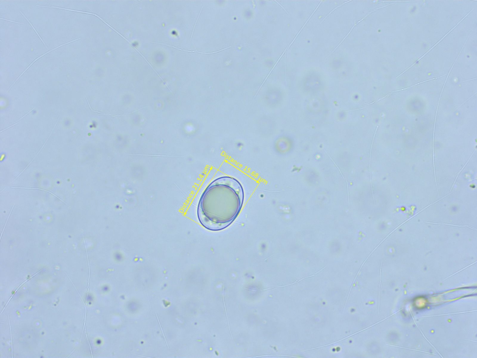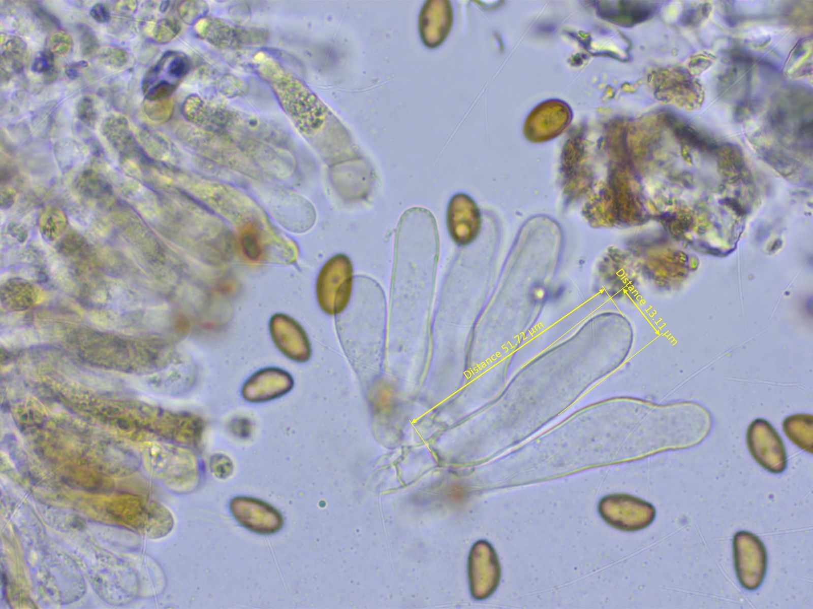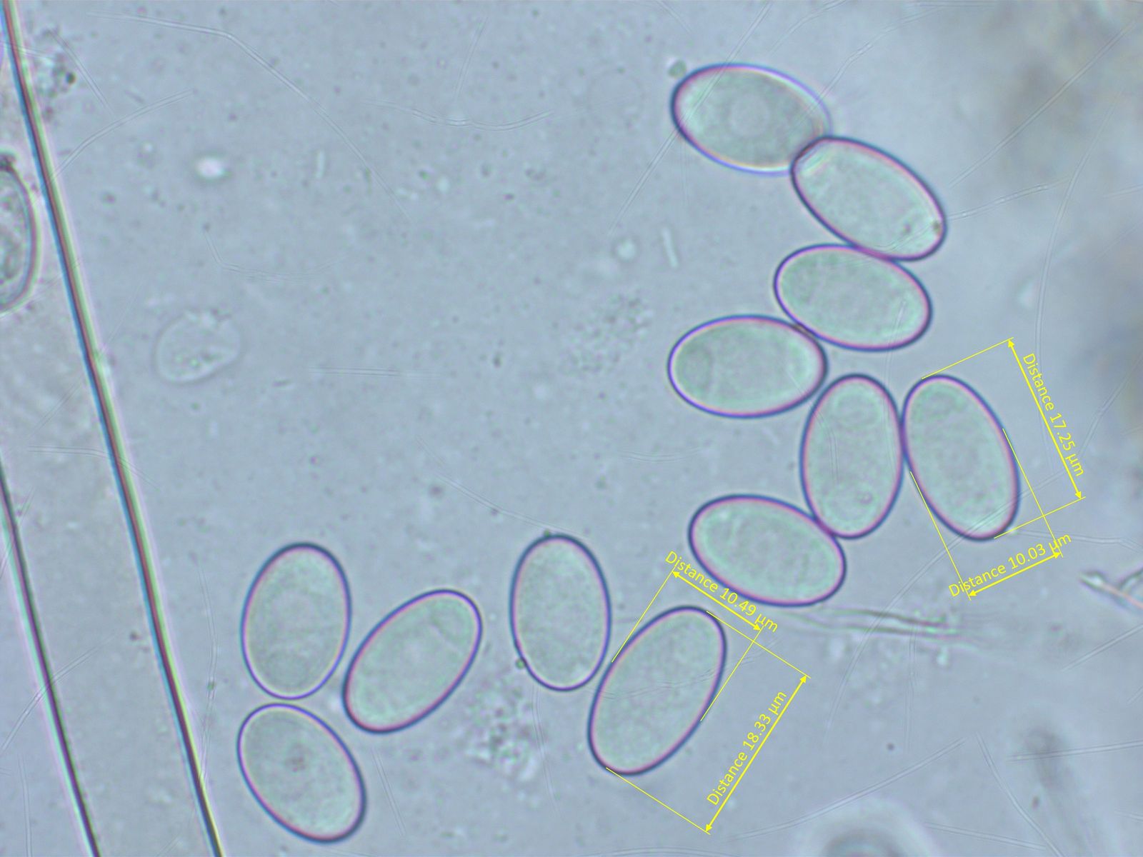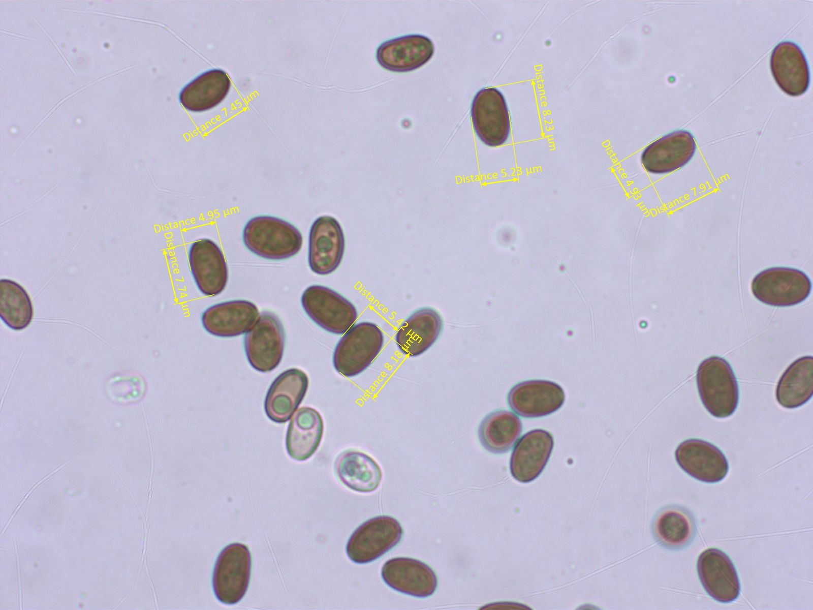 Die Sporen sind recht gross. Ich habe noch nicht brav nach Schulbuch ganz viele gemessen. Etwa 13.2-14.6 x 7.3-8.1 µm.