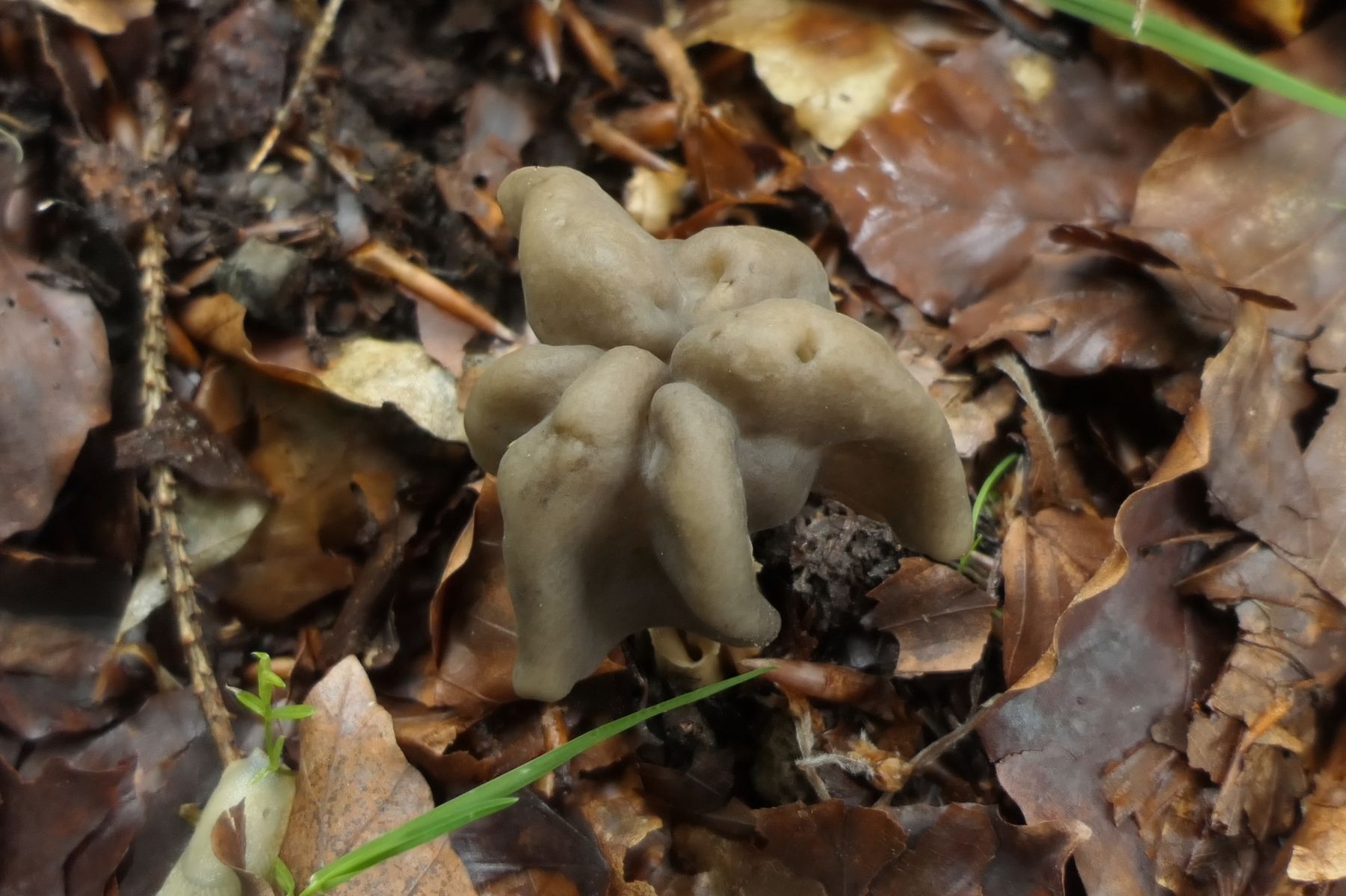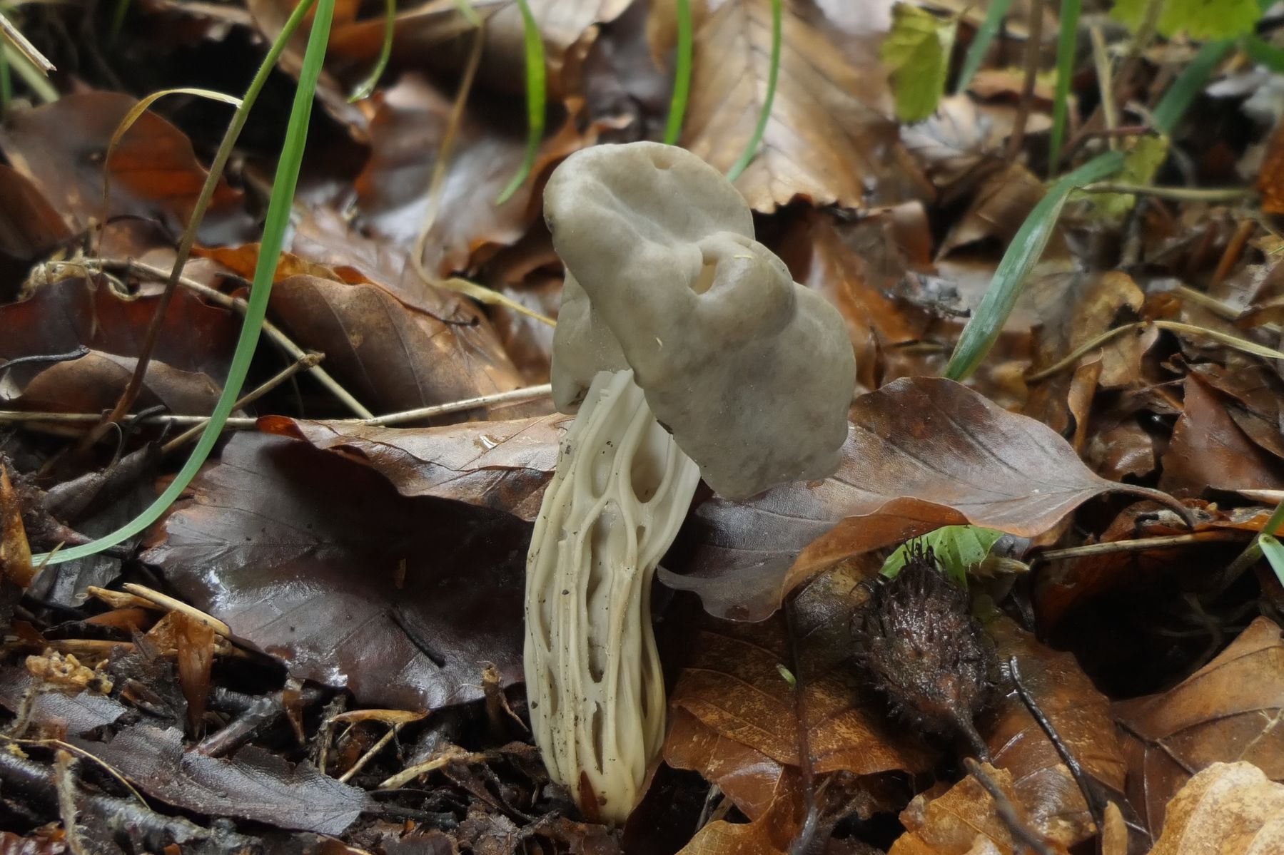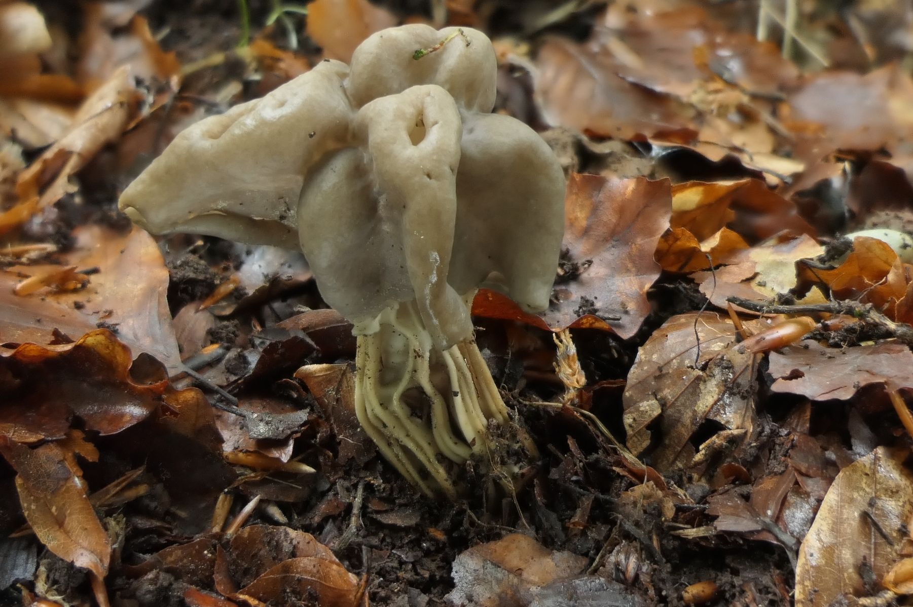 In größerer Zahl auch schon seit wohl 14 Tagen da eine graue Helvella unter reinem Buchenbestand mit starkgerippten Stielen.