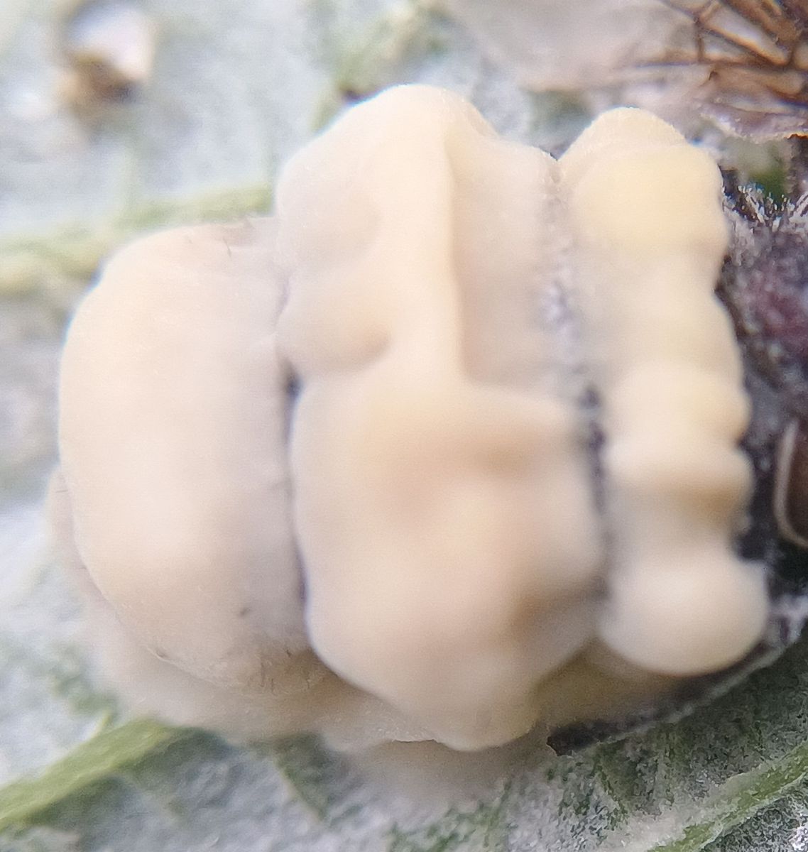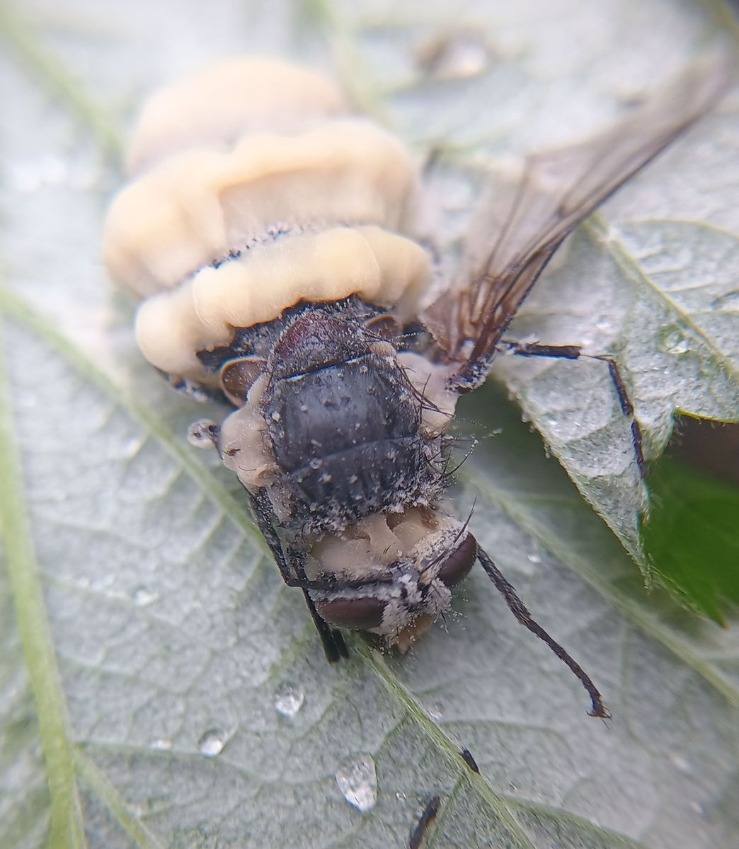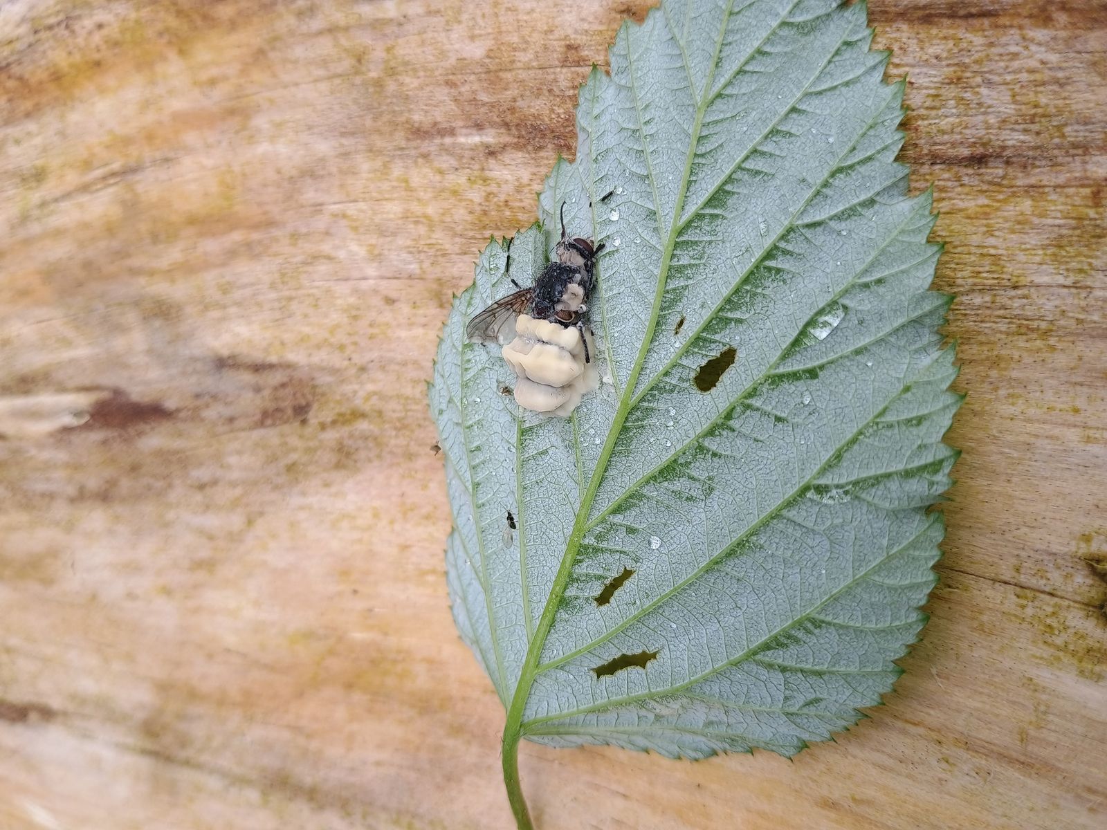 Dort hat meine Frau mit ihren Adleraugen "irgendwatt komischet" auf einem Rubus spec. Blatt entdeckt. Und siehe, ein Fliegentöter in natura.
