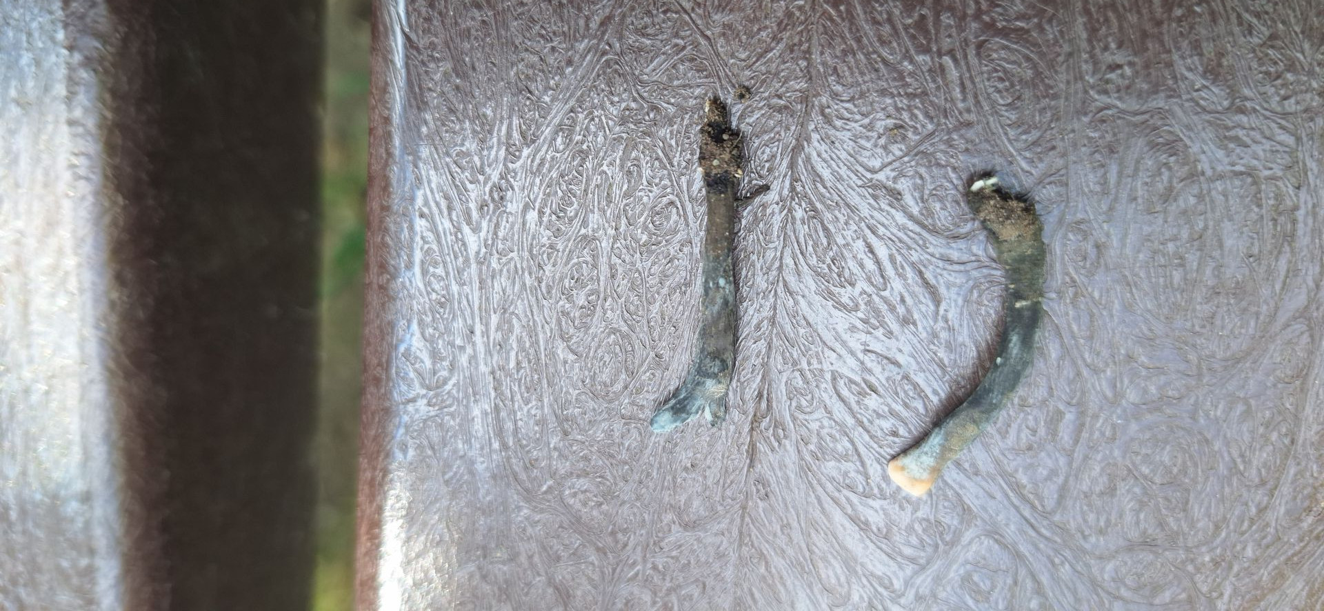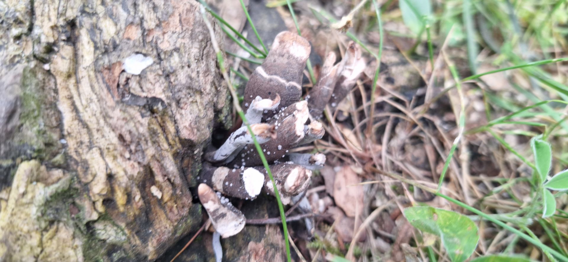 Farbe Fruchtkörper: zur Basis hin dunkler bis schwärzlich, am oberen Ende weißlich/gräulich, teils auch beige bräunlich mit rotbräunlichen Anteilen, manche, die dickeren vor allem, teils auch fast ganz dunkelgrau bis schwärzlich. Bei manchen auf dem Stiel weißliche Punkte, wie Tröpfchen. Manche am oberen Ende rissig (vielleicht wegen der Trockenheit).