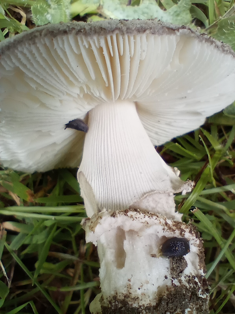 Ein schönes Stadium, wie ich finde. Hier kann man noch gut erkennen, wie sich der Ring vom "Bergsteigersöckchen" (das keines ist) trennt. In meiner Fantasie sieht man auch, wie die Riefen am Ring durch die Lamellen "geprägt" wurden. Allerdings weiß ich nicht, ob das überhaupt so ist. Das "Söckchen" ist leider nicht so deutlich ausgeprägt, ich glaube daran haben sich die Schnecken, die auf den Bildern zu sehen sind, schon gütlich getan (klar, schließlich ist das ja auch keins, wie sich das für den Grauen gehört