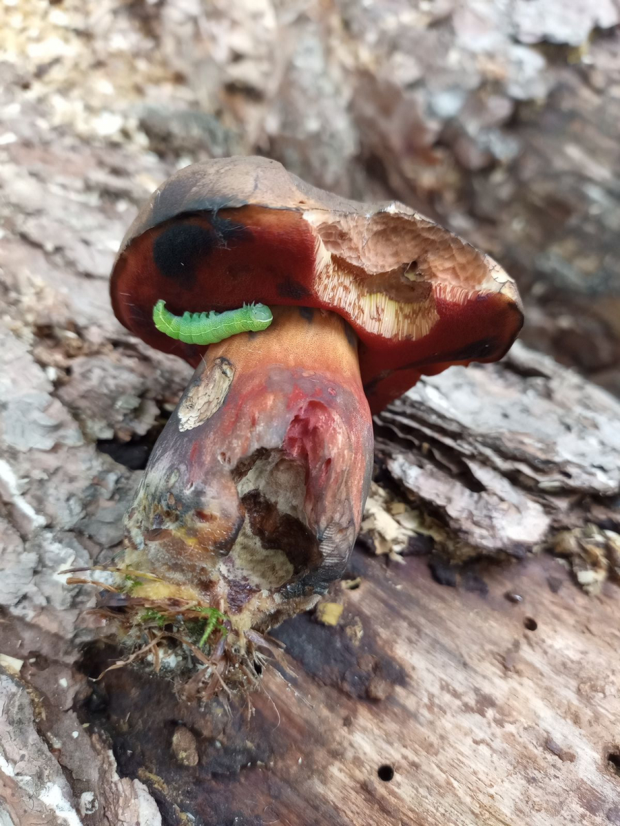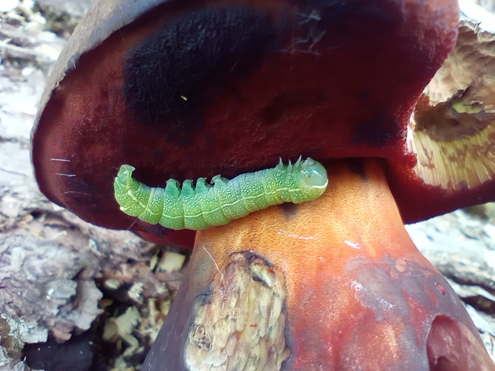 Dieser vermadete und arg angefressen Flocki war mir ein Foto wert, weil sich die Raupe so schön unter den Hut geklemmt hatte. Vielleicht suchte die Schutz vor Regen... Rot und Grün bringen einen hübschen Kontrast. Ich habe keine Ahnung von solchem Krabbelzeug, meine App nennt die Rundflügel-Kätzcheneule (Orthosia cerasi).