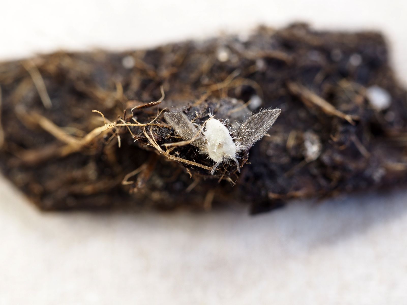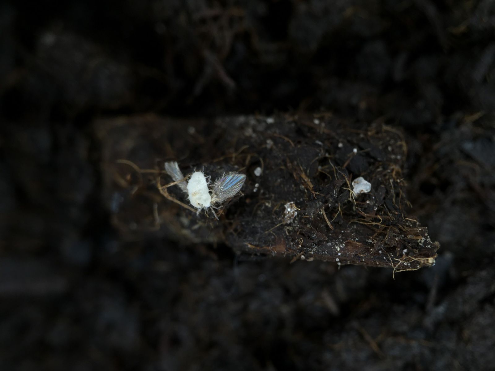 Befallene Schmetterlingsmücke (Psychodida spec.) auf Erdkrume