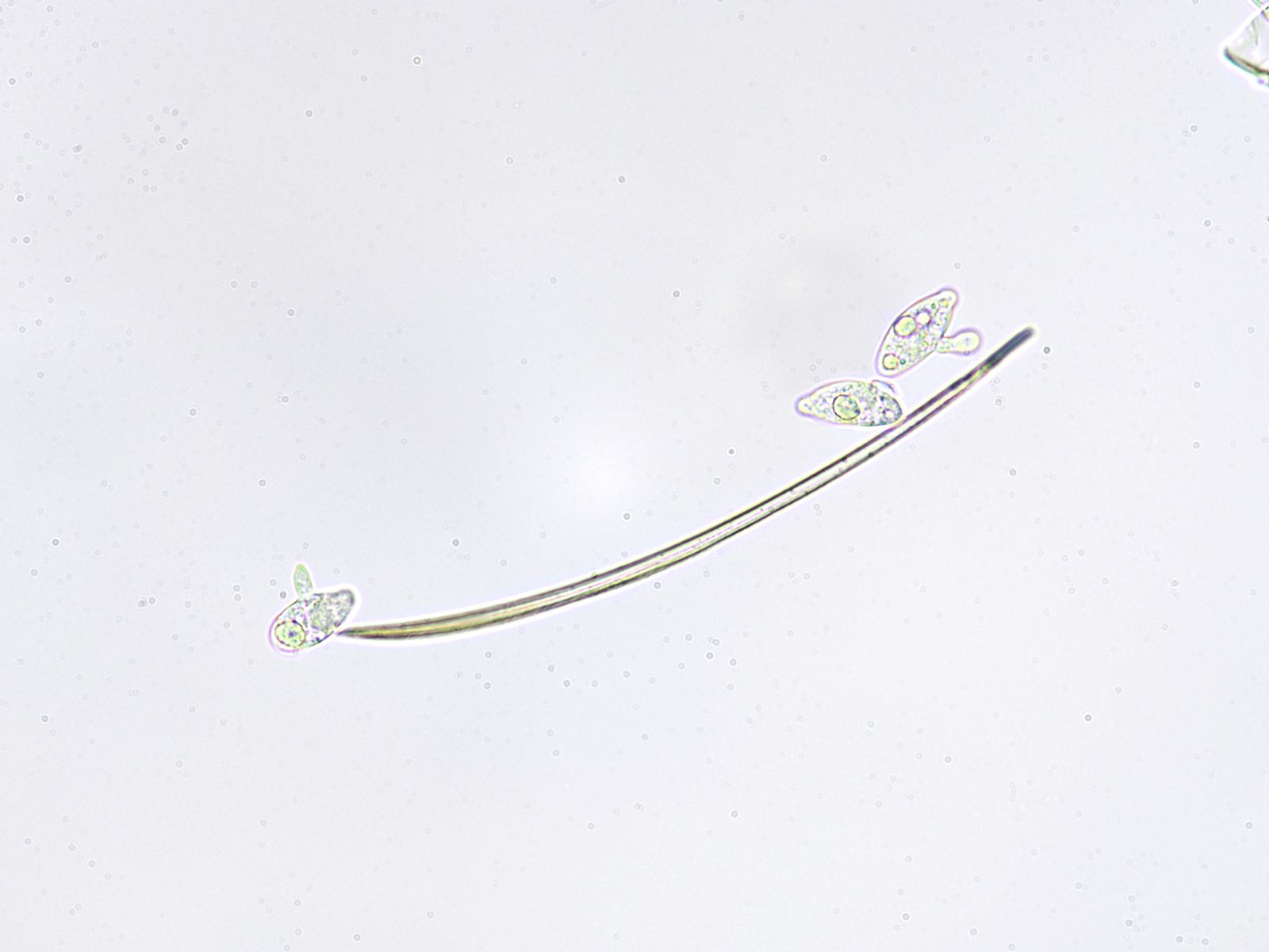 Damit landet man dann bei der Gattung Erynia und hier passen dann die Sporen auch und alles hat seine Richtigkeit. Es sind also Primärsporen und Sekundärsporen. Auch die Zystiden passen zur Gattung. Zudem war die usprüngliche Bestimmung des Wirtes als Sciarida falsch, denn es handelt sich um eine Psychodida.