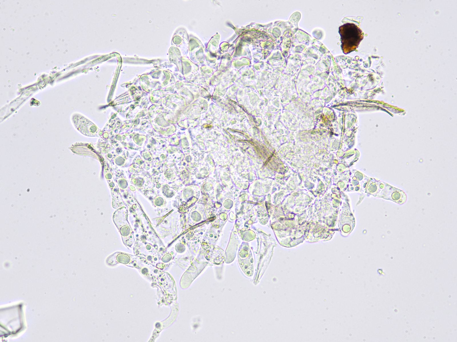manche Primärkonidien schienen von einer Art hyaliner Hülle umgeben zu sein, leider habe ich keine Färbungen getestet um sie näher zu charakterisieren (Mucus etc).