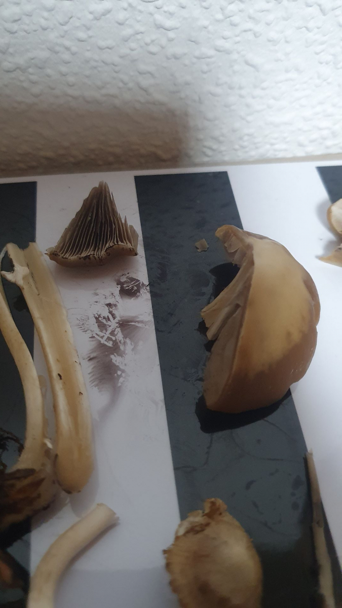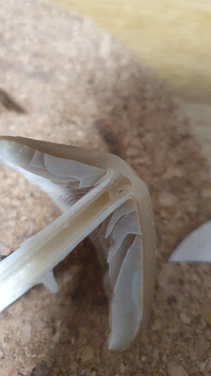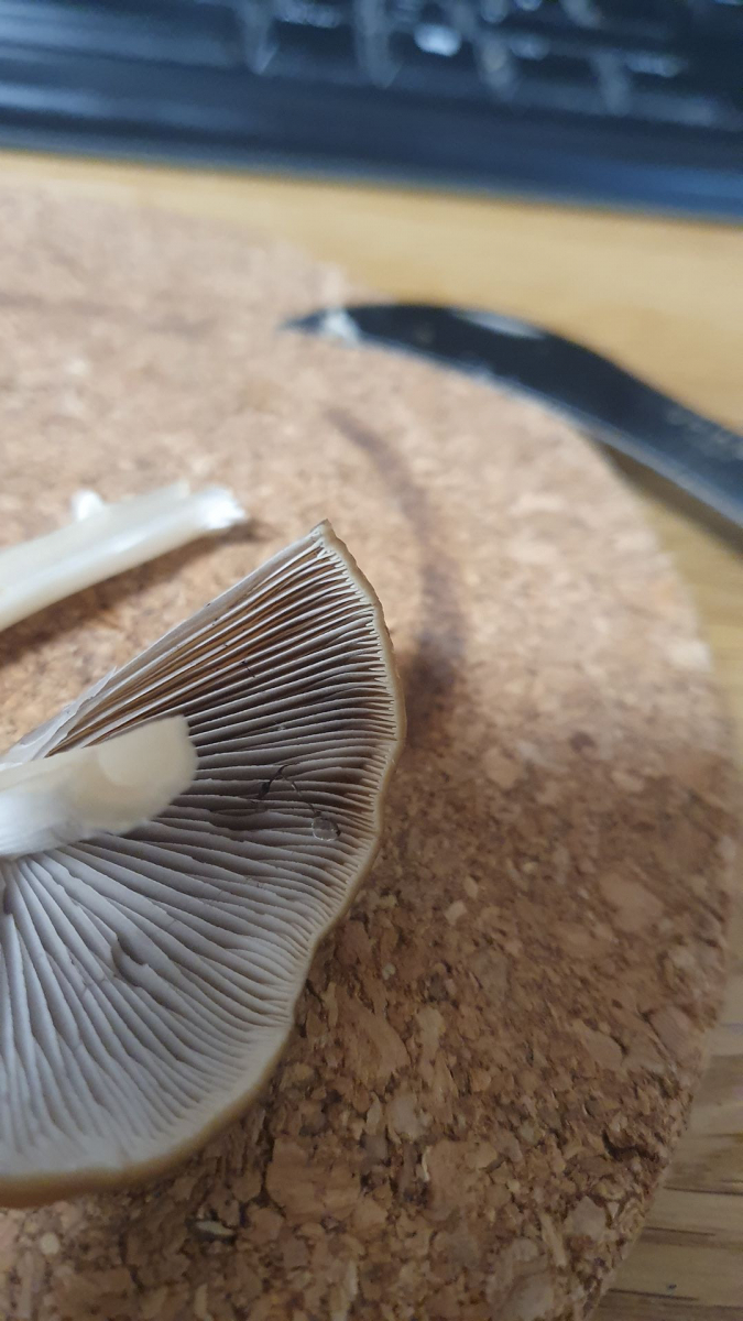 Lamellen: Angewachsen, mit Zwischenlamellen, Weiß-grau evtl. mit violettem Ton, hellere Schneiden, wurden jedoch schnell grau-braun beim aussporen.