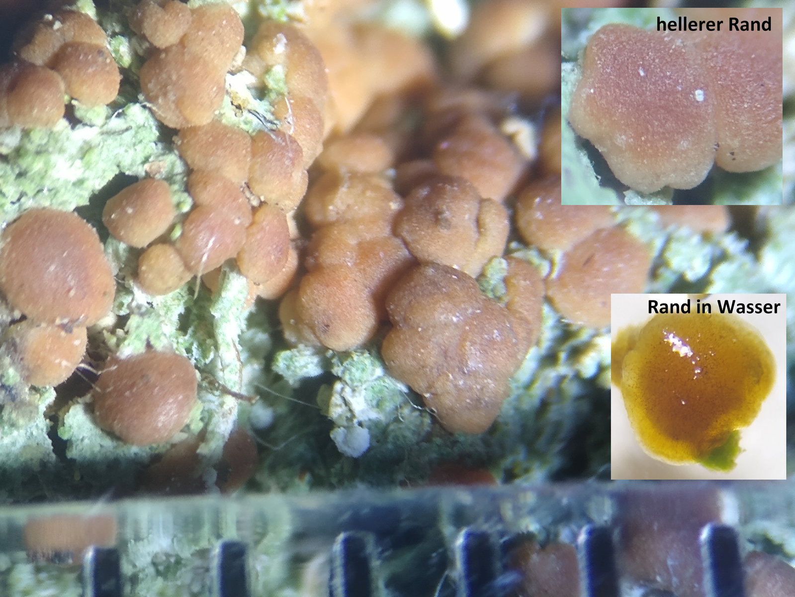 Bild 21 Bilimbia cf. microcarpa mit üppigen orangebraunen Apothecien auf grünem Thallus über Moos
