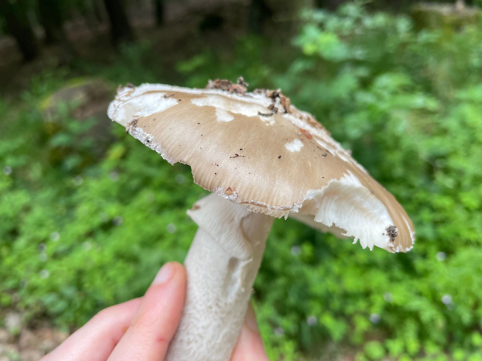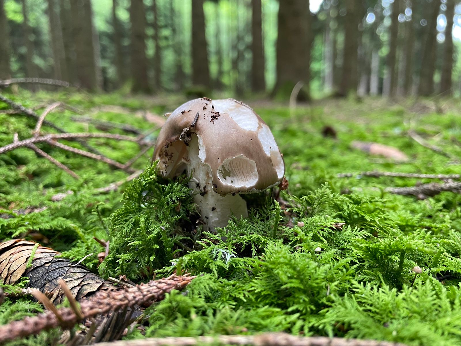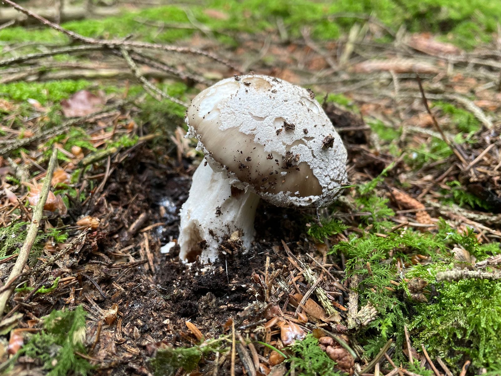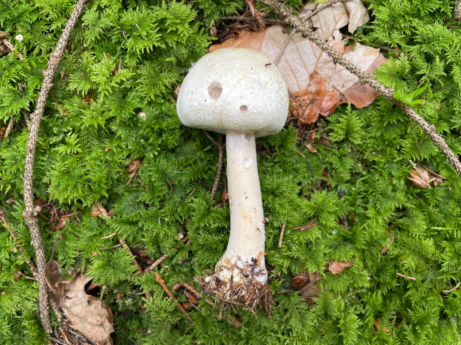 Einen großen Grauen Wulstling gab es auch zu finden. Prinzipiell die ideale Größe für Speisezwecke, der Fruchtkörper hat aber meine Sicherheitsregel nicht bestanden. Sobald ein Merkmal komisch ist, bleibt er im Wald. In diesem Fall komische Knolle und geriefter Hutrand. Better safe than sorry.