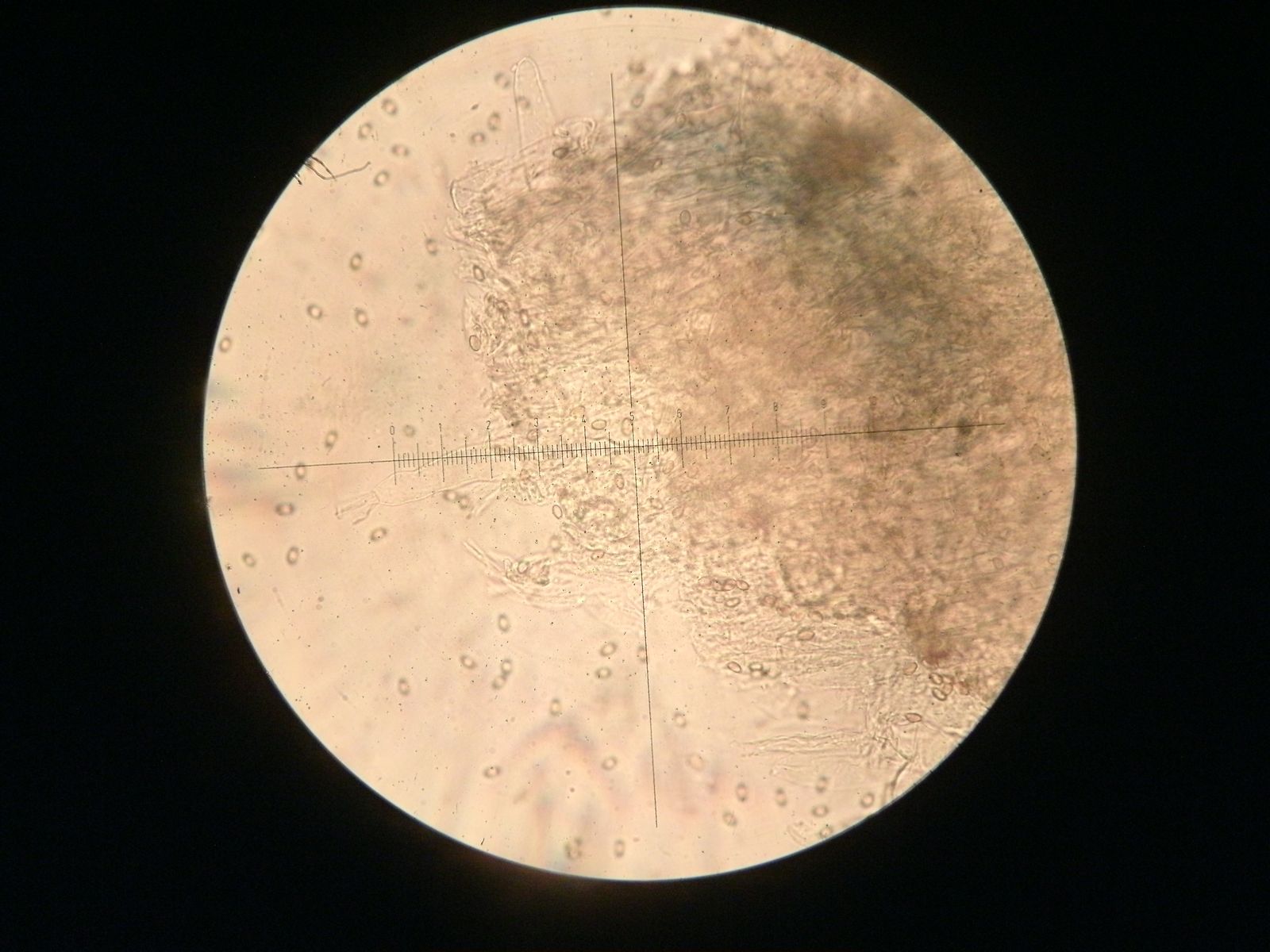 Einzelne Basidien habe ich gefunden, die haben sich aber ziemlich gegen Fotos gewehrt, aber immerhin habe ich eine Breite von irgendwas um 4μm (N=1).