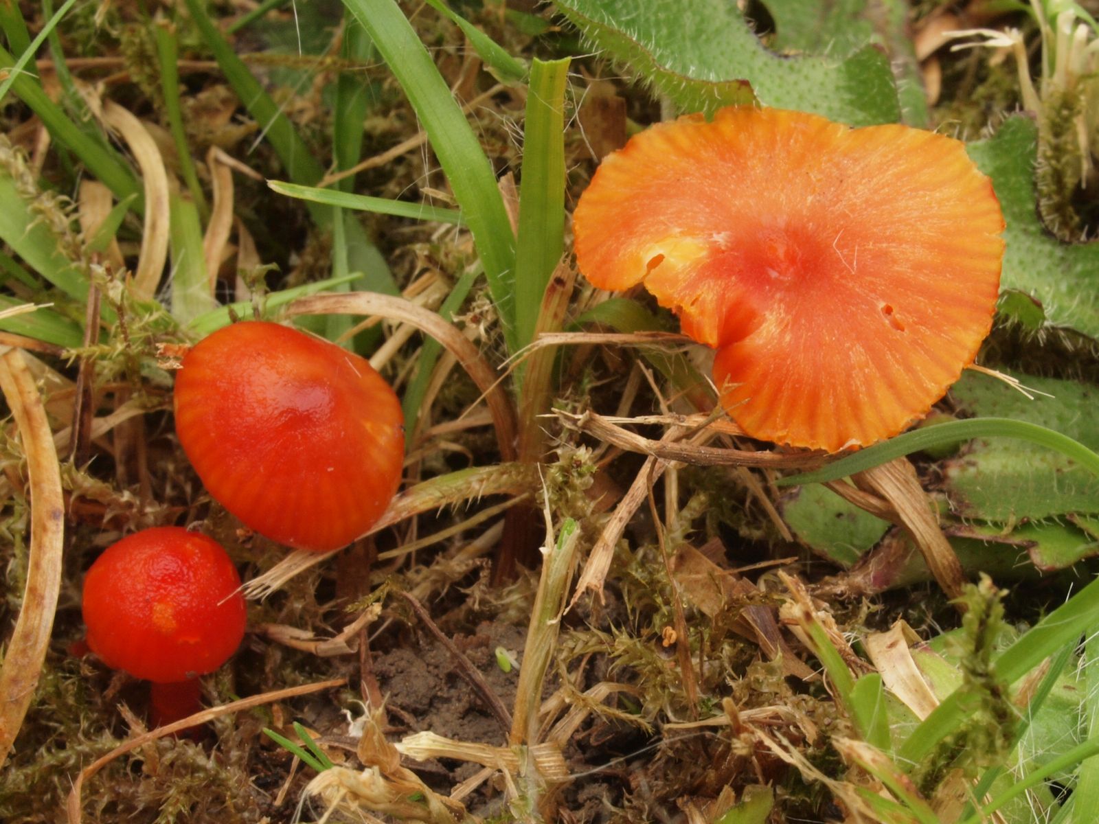 mehrere Hygrocybe conica fa. pseudoconica (Stattlicher Kegel-Saftling) mit daumendicken Stielen