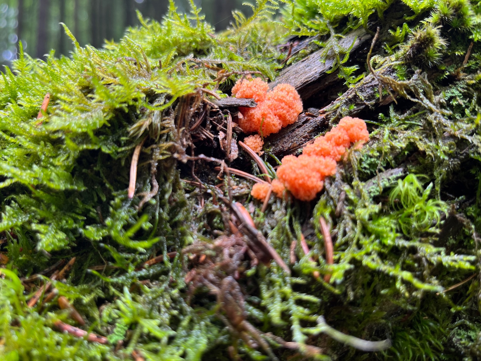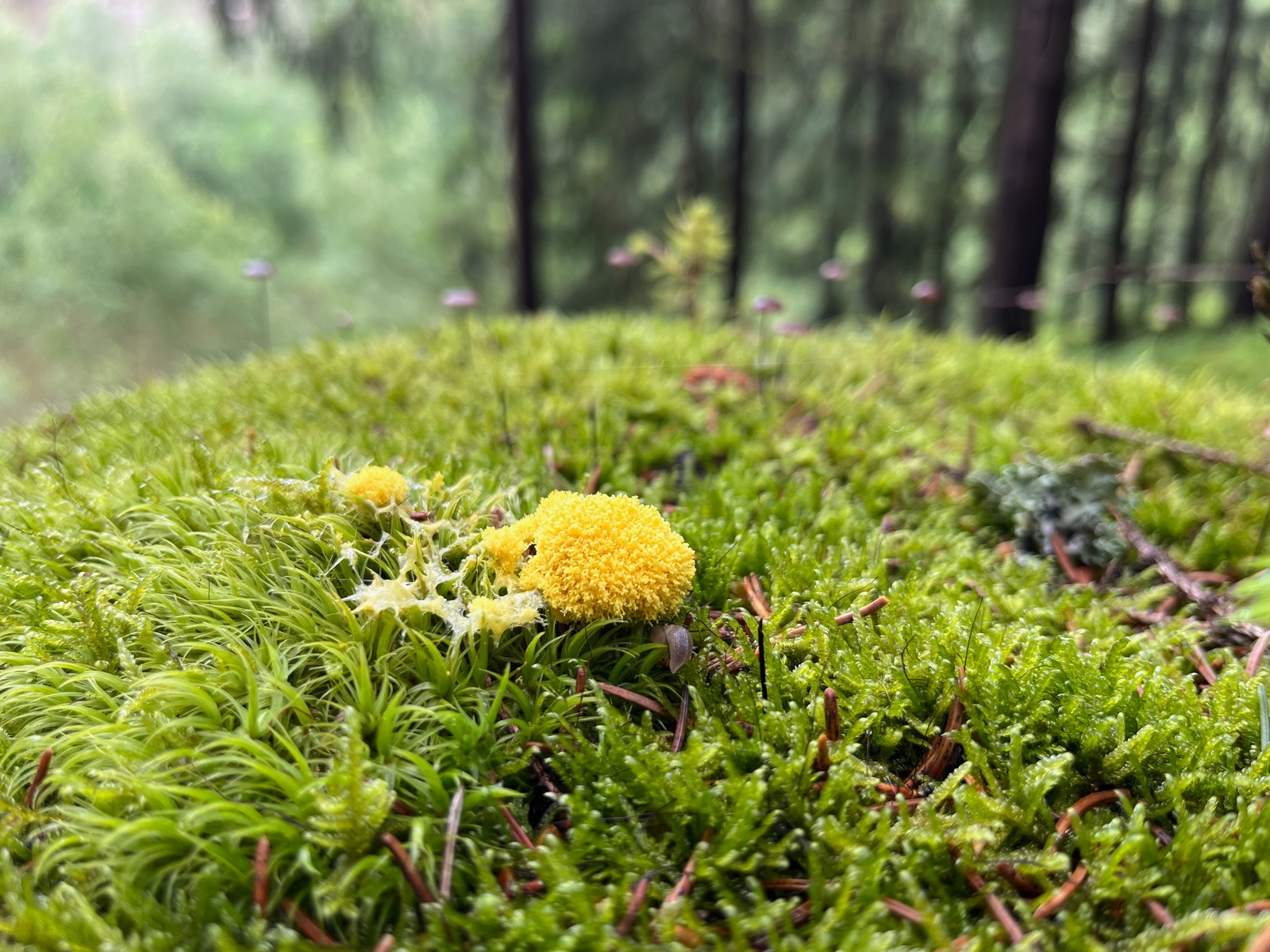 Hübsche Schleimer und Winzlinge machen sich überall im nassen Wald breit. Gelbe Lohblüte mit Schwindlingshintergrund.