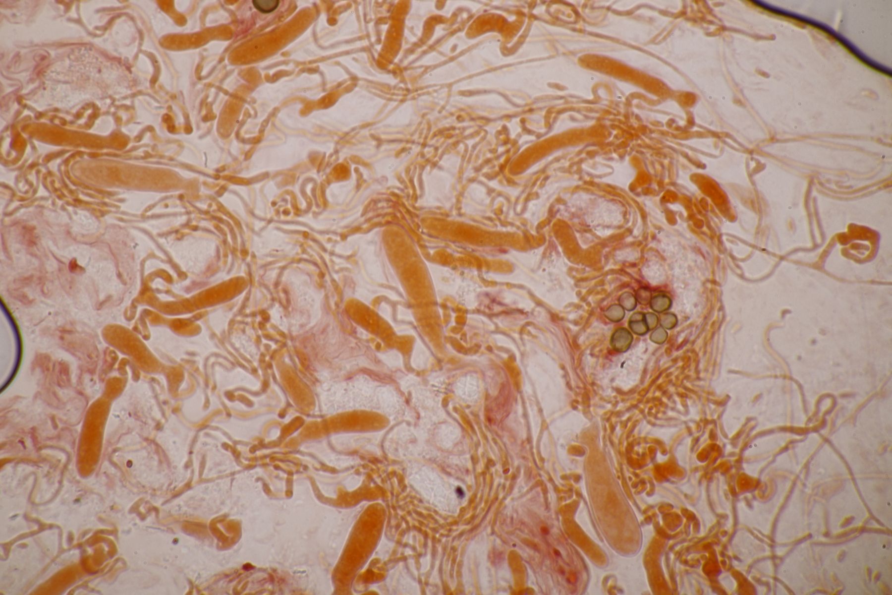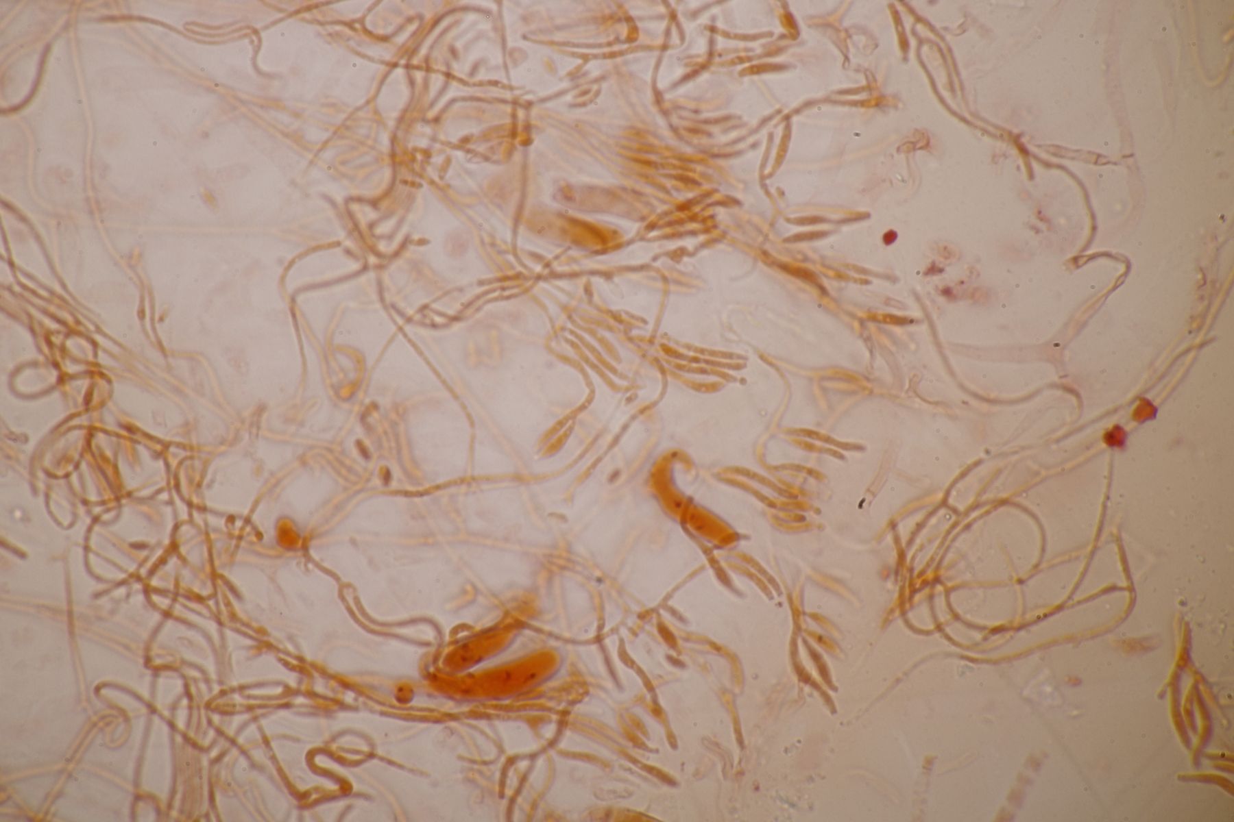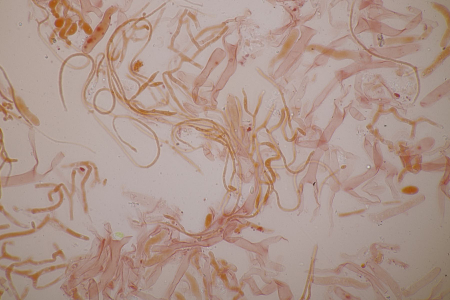 Unter dem Mikroskop zeigte sich dann sehr schnell, daß hier tatsächlich ein Befall vorliegt, aber nicht wie vermutet durch Occultifur internus oder eine der verschiedenen Tremella-Arten, die in Dacrymyces parasitieren, sondern durch einen Ascomyceten. Felli hatte mich seinerzeit mal auf Helicogonium hingewiesen und das scheint auf diesen Fund hier auch gut zuzutreffen. Nur mit der Artbestimmung wird es dann schwierig. Zum einen ist der vorliegende Fund leider unreif und die zahlreich vorhandenen Asci sind ohne Sporen/Ascokonidien. Zum anderen gibt es in der Literatur zwar zwei Helicogonium-Arten, die in Basidiomyceten parasitieren (die anderen Arten leben in Ascomyceten), diese sind aber nicht von Dacrymyces bekannt.