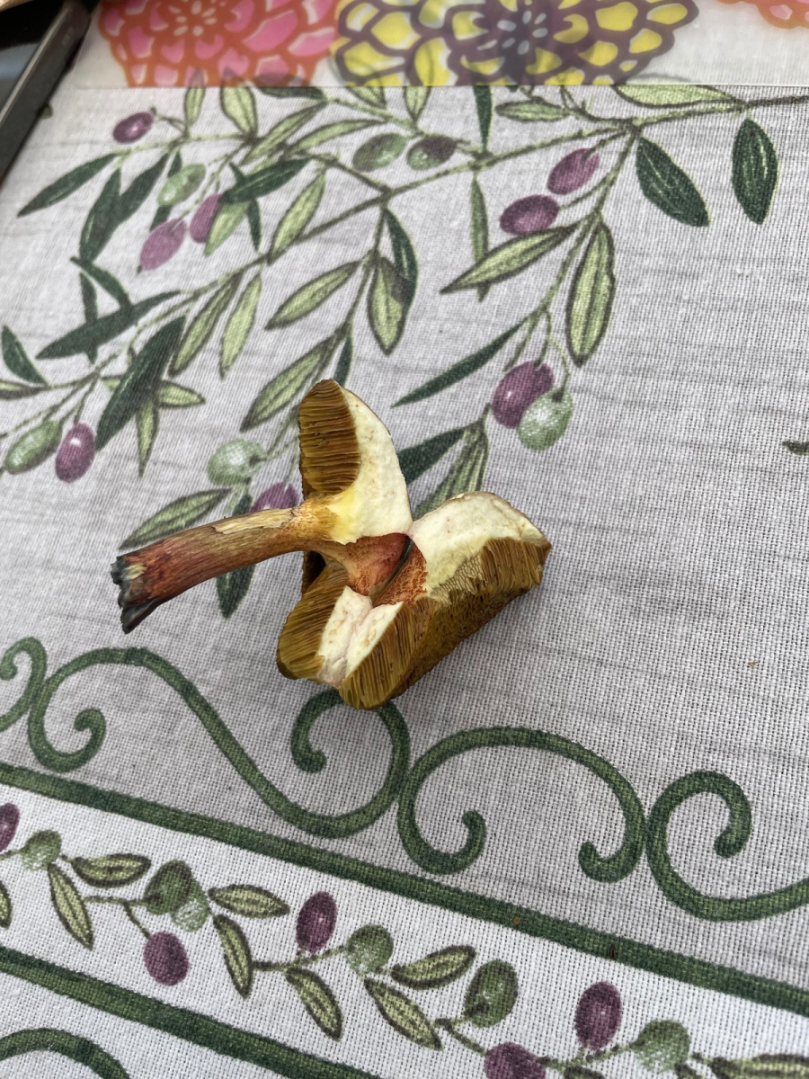 bei den düsteren Farben hätte ich den Röhrling auch so schön als Falschen Rotfußröhrling (X. porosporus) bezeichnet. Ein vollständiger Längsschnitt würde da die letzten Zweifel beseitigen. Essbar ist der sicher nicht mehr.
