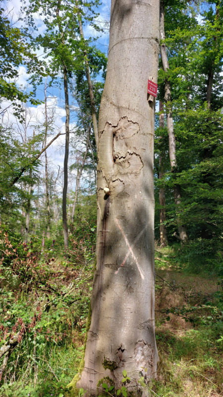 Die Buche scheint mir aber nicht besonders gesund zu sein, wenn man sich den unteren Teil ansieht. Oder ist das einer der wie eine Seuche um sich greifenden Hundepisse-Schäden? Und das X wird auch seine Bedeutung haben.