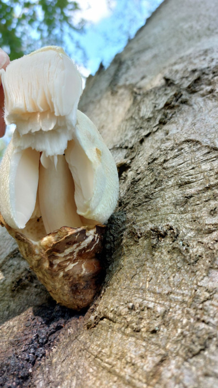 ich vermute, du hast einen "Wolliger Scheidling" (Volvariella bombycina) gefunden. Ich kenne den leider nicht von einem eigenen Fund, aber der ist makroskopisch ziemlich typisch, wie ich ihn von Bildern kenne.