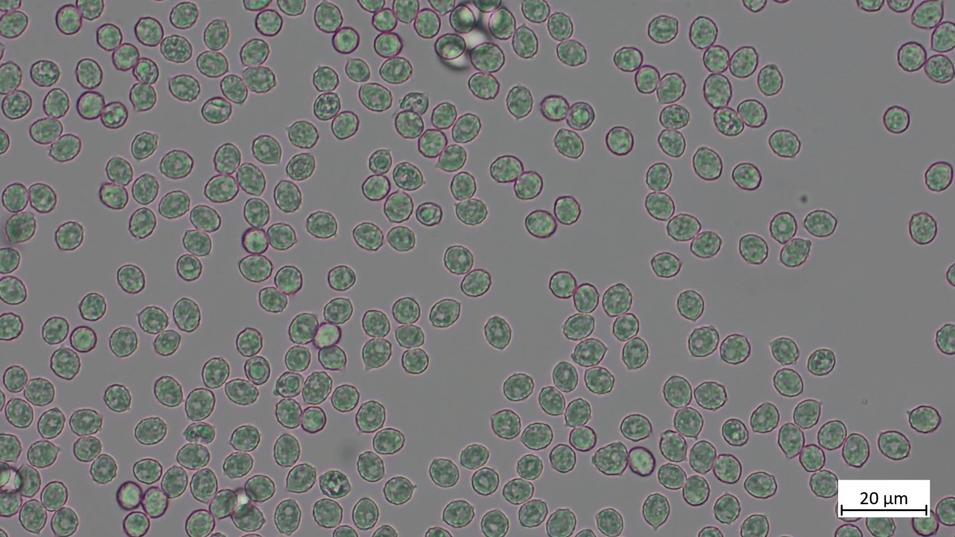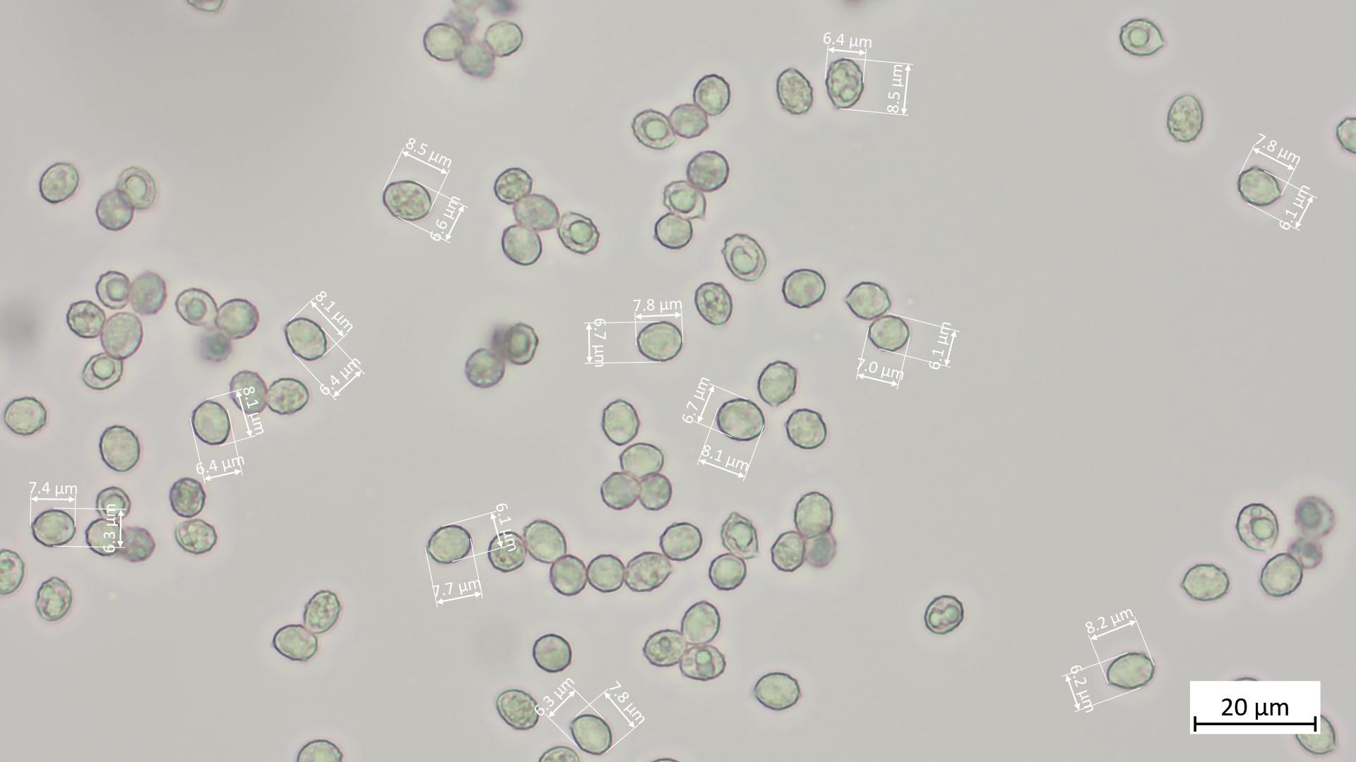 Unter dem 100x Objektiv erscheinen dieselben Sporen dann sogar etwas grünlich.