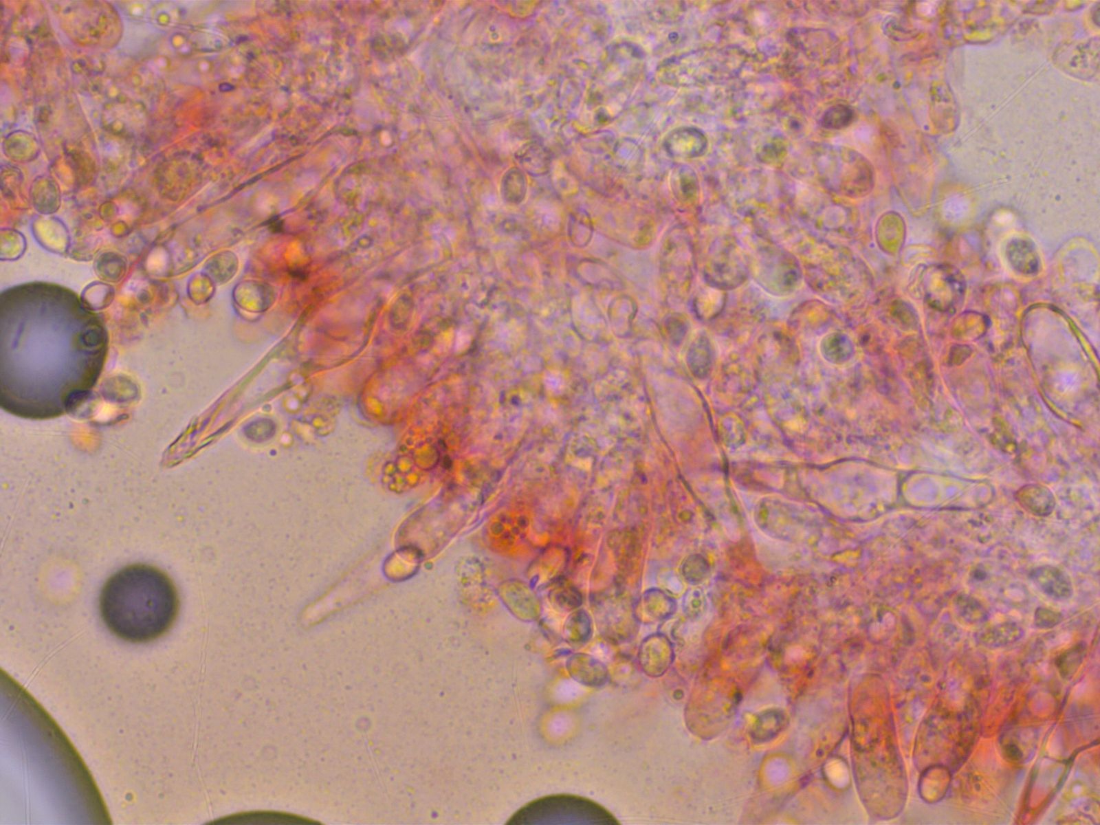 Ich habe einige Präparate der Lamellen erstellt und habe nach Cheiloszystiden gesucht. Ich habe auch viele Fotos gemacht, konnte aber nicht wirklich etwas finden. Die Fotos habe ich gerade nochmal durchgeschaut und auf einem noch etwas gefunden. Könnten diese Härchen etwas sein? Auf einem scheint zumindest eine Art Kristallschopf zu sitzen. Oft weiss ich einfach nicht genau, nach was ich eigentlich suche. :)