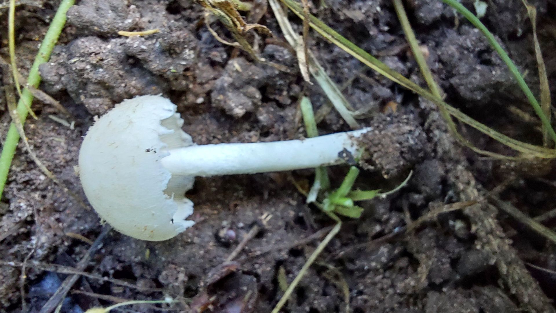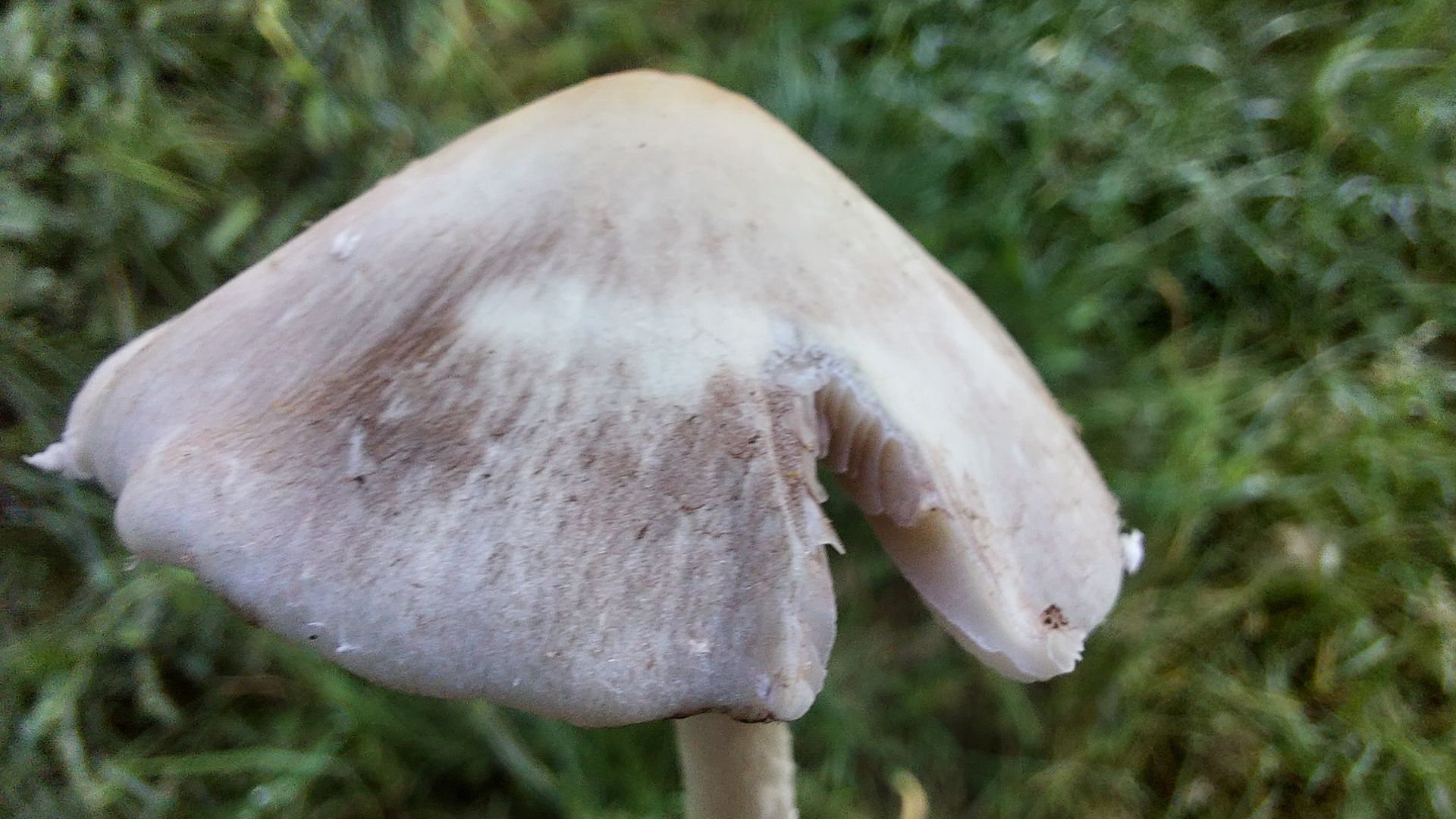 Hut weißlich mit violetten Nuancen und in der Hutmitte blass ocker-gelblich