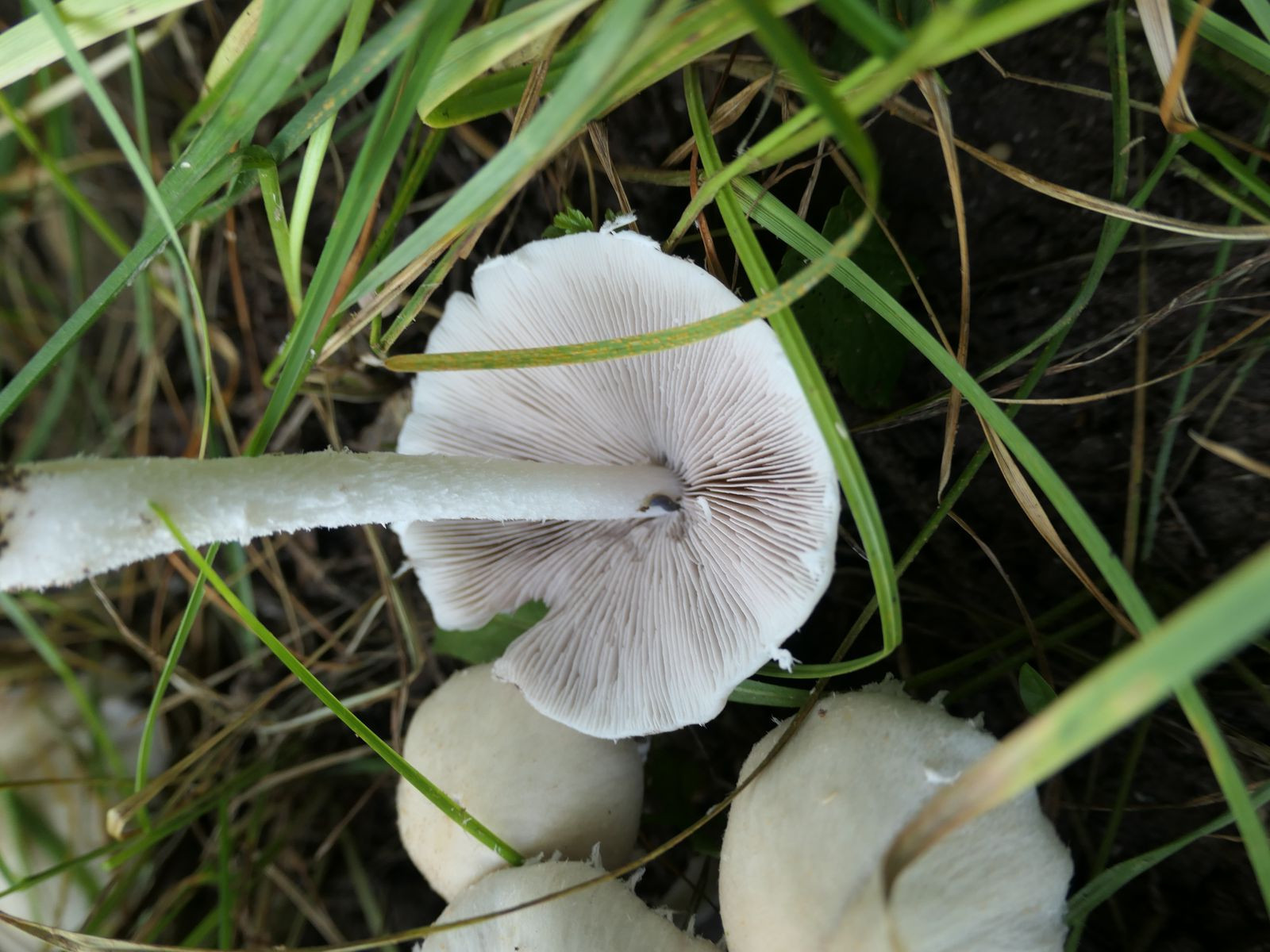 Lamellen graubraun mit violettem Ton; Stiel zylindrisch, basal etwas verdickt, weiß