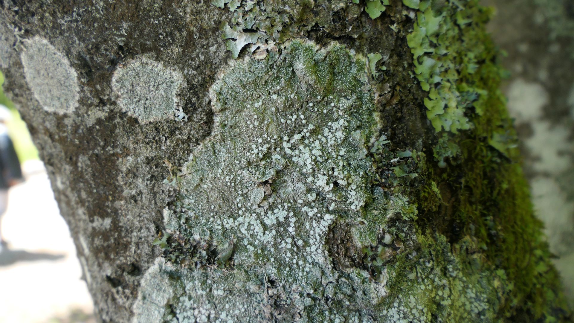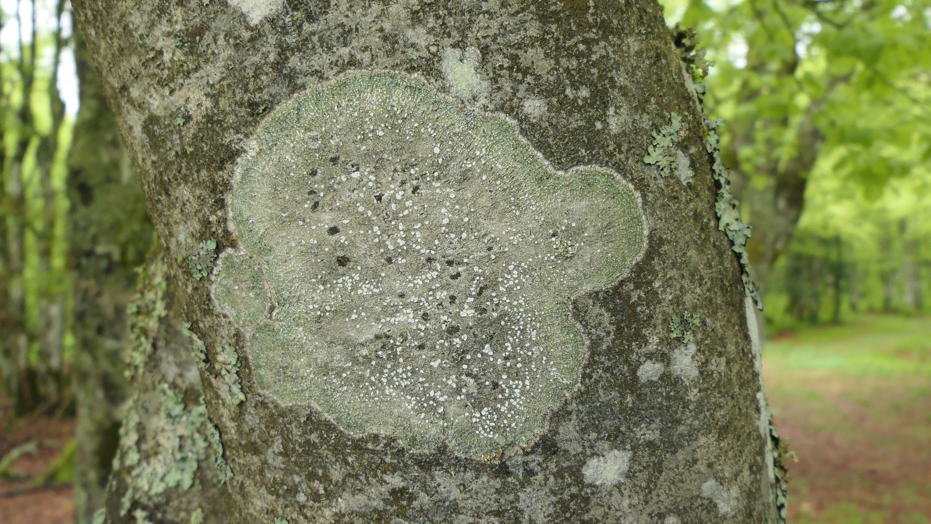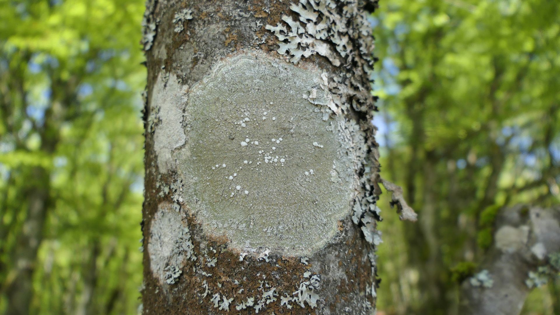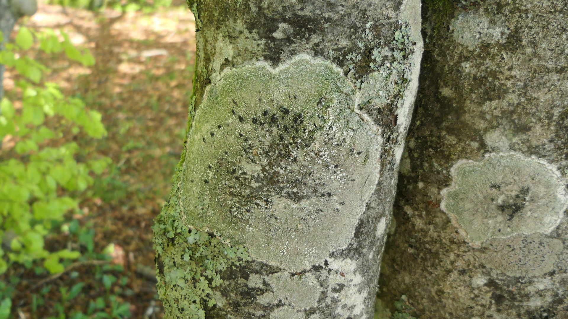 Eine häufige Flechtenart auf den Rotbuchenstämmen ist Lepra albescens (ehemals Pertusaria) mit ihrem typisch gezontem Vorthallus, dem wachsig glänzenden, knorpeligen Thallus und den flachen, weißen Soralen.