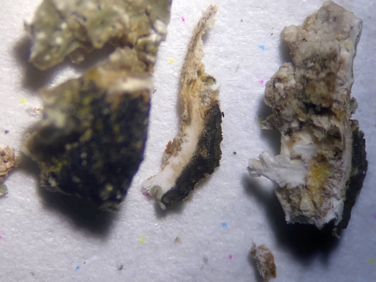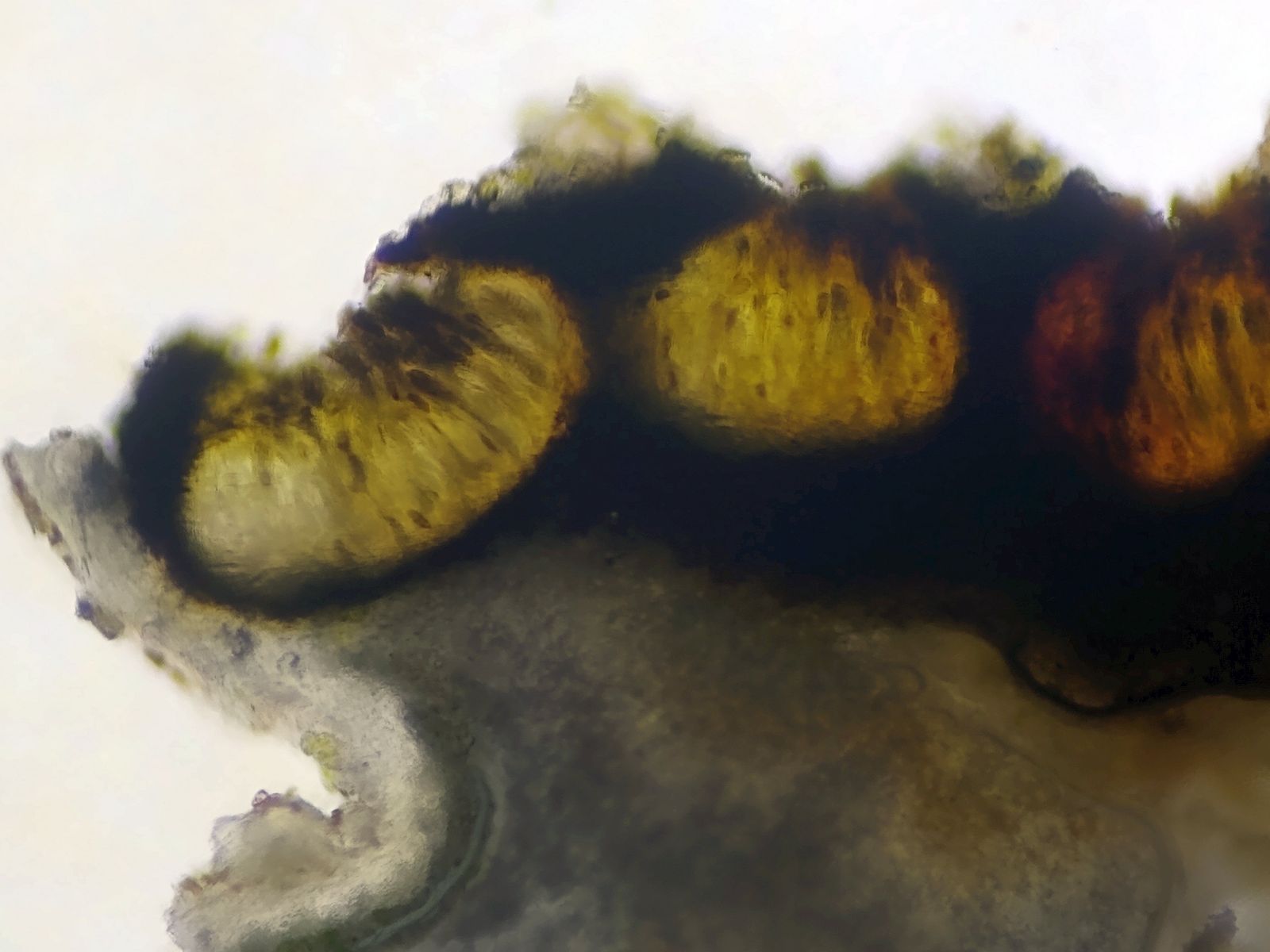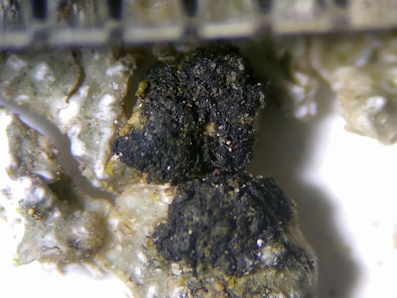 Die Verteilung und Anordnung der schwarzen Fruchtkörper sprcht gegen die Vermutung, der Pilz sei nur von der Flechte überwachsen.