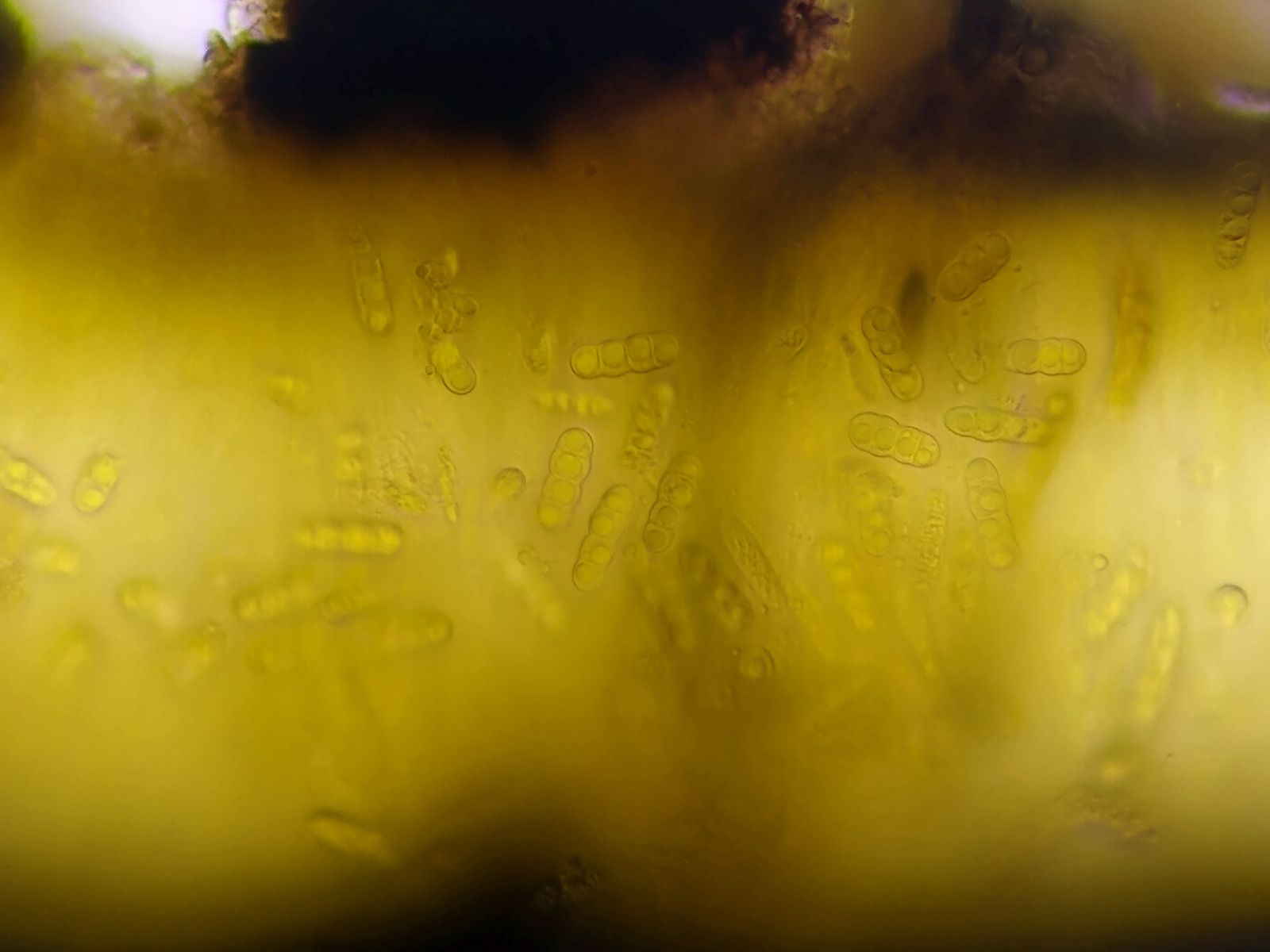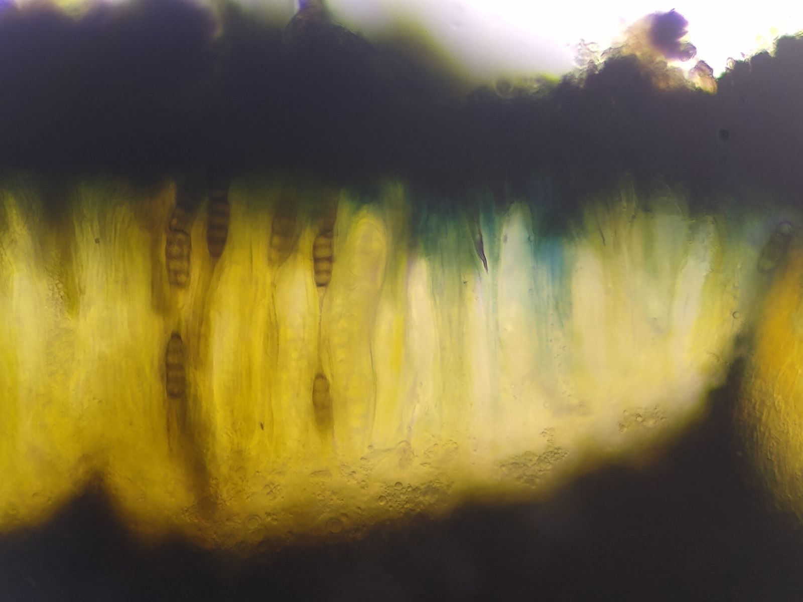 Bild 11 Schnitt durch Sammelfruchtkörper aus Bild 10 mit bernsteinfarbenem Hymenium und dunklen Sporen (in Wasser, Durchlicht)