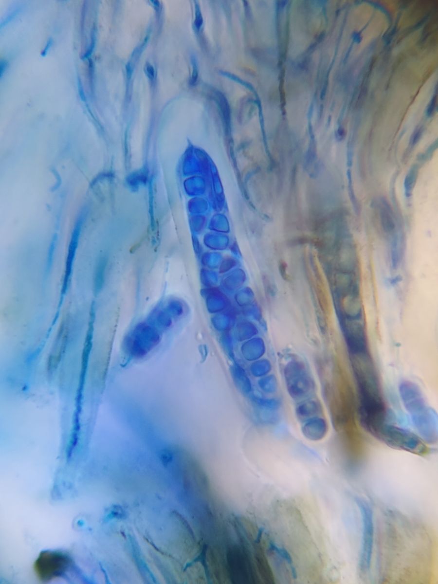 Asci (um 60x15 µm) und Sporen (um 24x8 µm) inamyloid (J-)