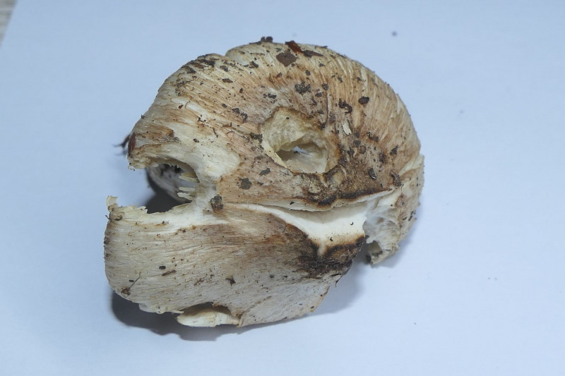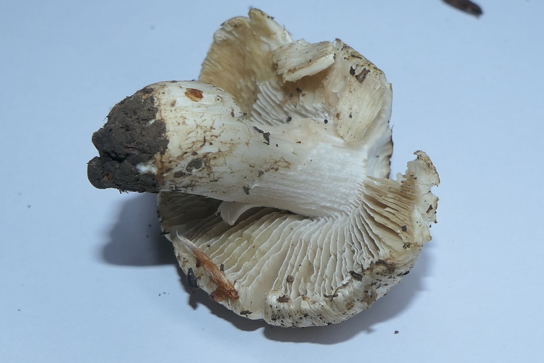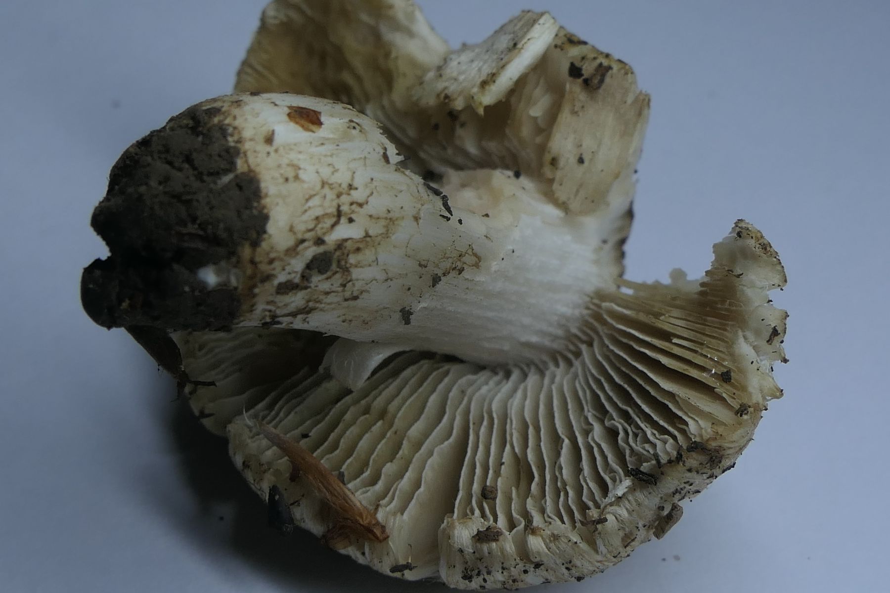 Dann gabs noch einen Risspilz der in der Nähe des ersten I.erubescens stand (ebenfalls Buchen, Kiefern). Nochmal größer und deutlich kompakter. Da ergab sich die Frage, ob ggf. auch erubescens. Ich habe den Fruchtkörper dann zum Abgleich mitbekommen. Die Art zeigte sich allerdings schlußendlich gar nicht rötend. Leider hatte ich davon jetzt auch nur einen Einzelfruchtkörper, den ich selber an seinem direkte Standort nicht gesehen habe, der auch bereits sehr angegriffen war und letztlich am Stiel auch im unteren Teil abgegriffen.