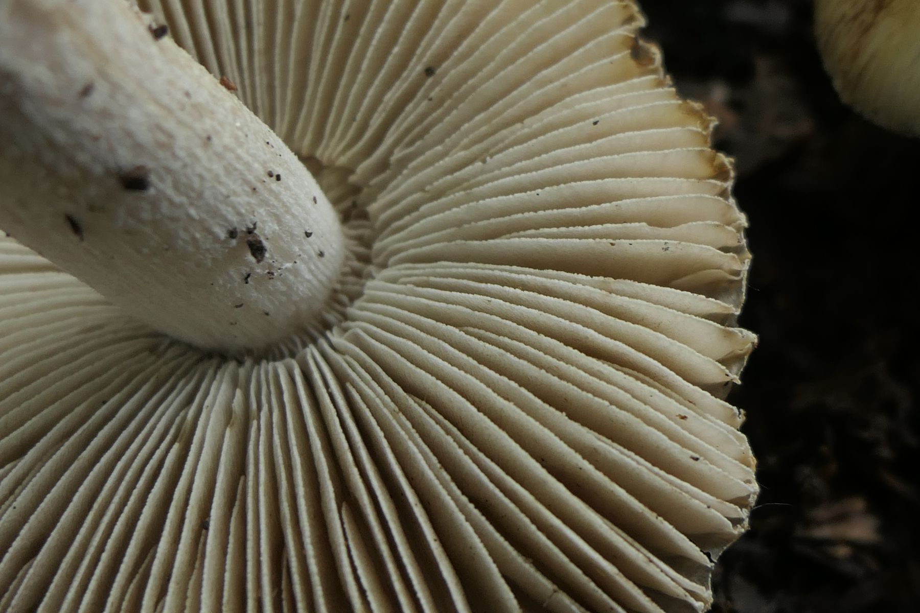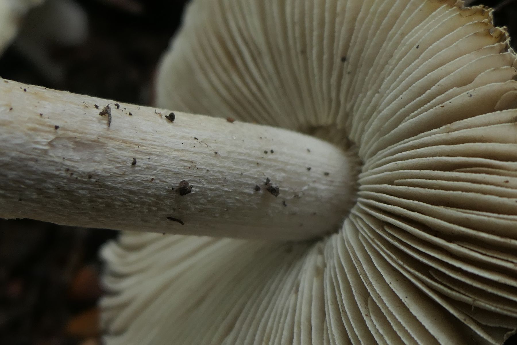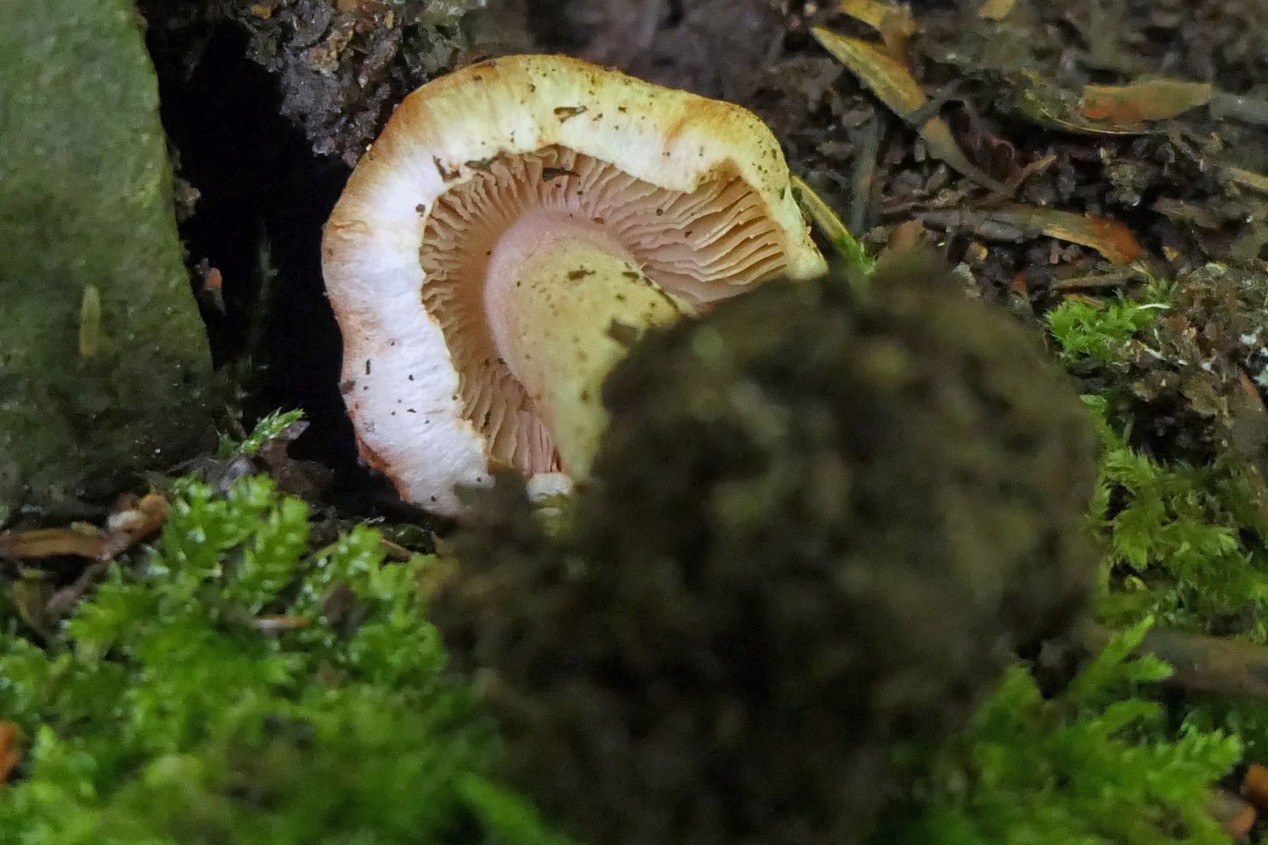 Dann gabs noch einen Risspilz der in der Nähe des ersten I.erubescens stand (ebenfalls Buchen, Kiefern). Nochmal größer und deutlich kompakter. Da ergab sich die Frage, ob ggf. auch erubescens. Ich habe den Fruchtkörper dann zum Abgleich mitbekommen. Die Art zeigte sich allerdings schlußendlich gar nicht rötend. Leider hatte ich davon jetzt auch nur einen Einzelfruchtkörper, den ich selber an seinem direkte Standort nicht gesehen habe, der auch bereits sehr angegriffen war und letztlich am Stiel auch im unteren Teil abgegriffen.