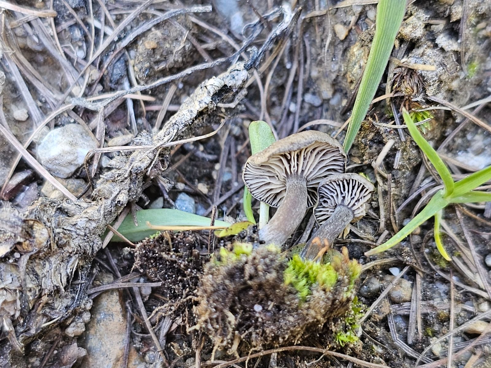 In der Nähe von Lärchen und Kiefern gab es diesen Trichterling mit Rhizomorphen an der Stielbasis.
