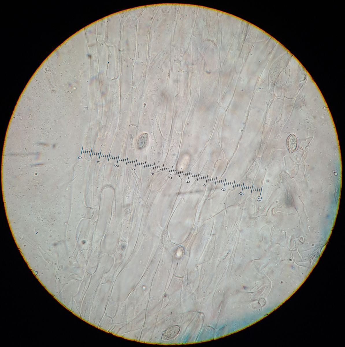 Es gibt aufgeblasene Zellen die breiter als 10μm sind (die Eichung meiner Strichplatte beim 100er Objektiv ist 97μm/100Teilstriche), allerdings auch solche, die normal filiform sind, wie für C. prunulus beschrieben. Wie die Abbildungen der Lamellentramas (sowohl prunulus als auch abprunulus) in der Publikation sieht diese hier nicht aus.