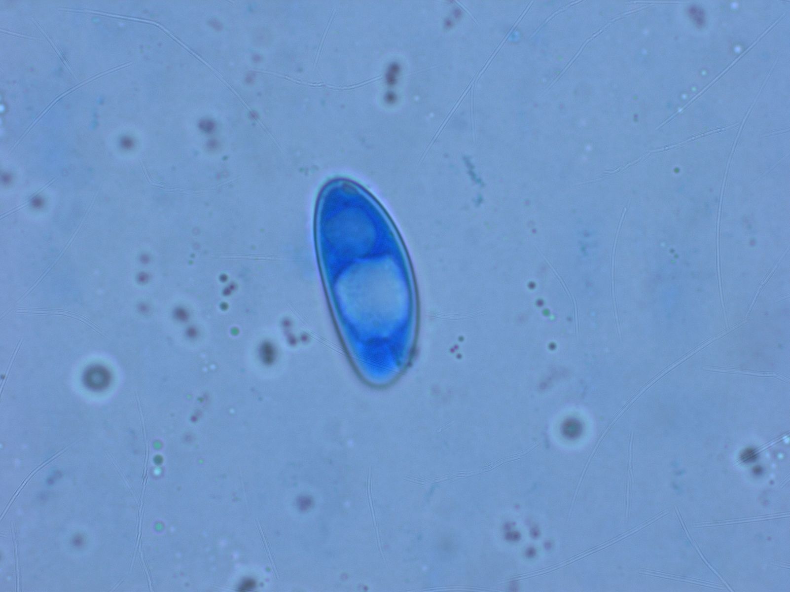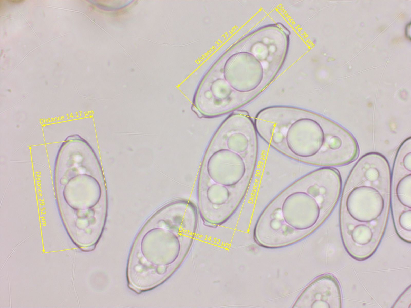 Wenigstens war sie voll reif, es gab einen schönen Sporenabwurf. Die Sporen sind riesig, bis über 35 µm lang, und haben kaum Auswüchse an den Enden.