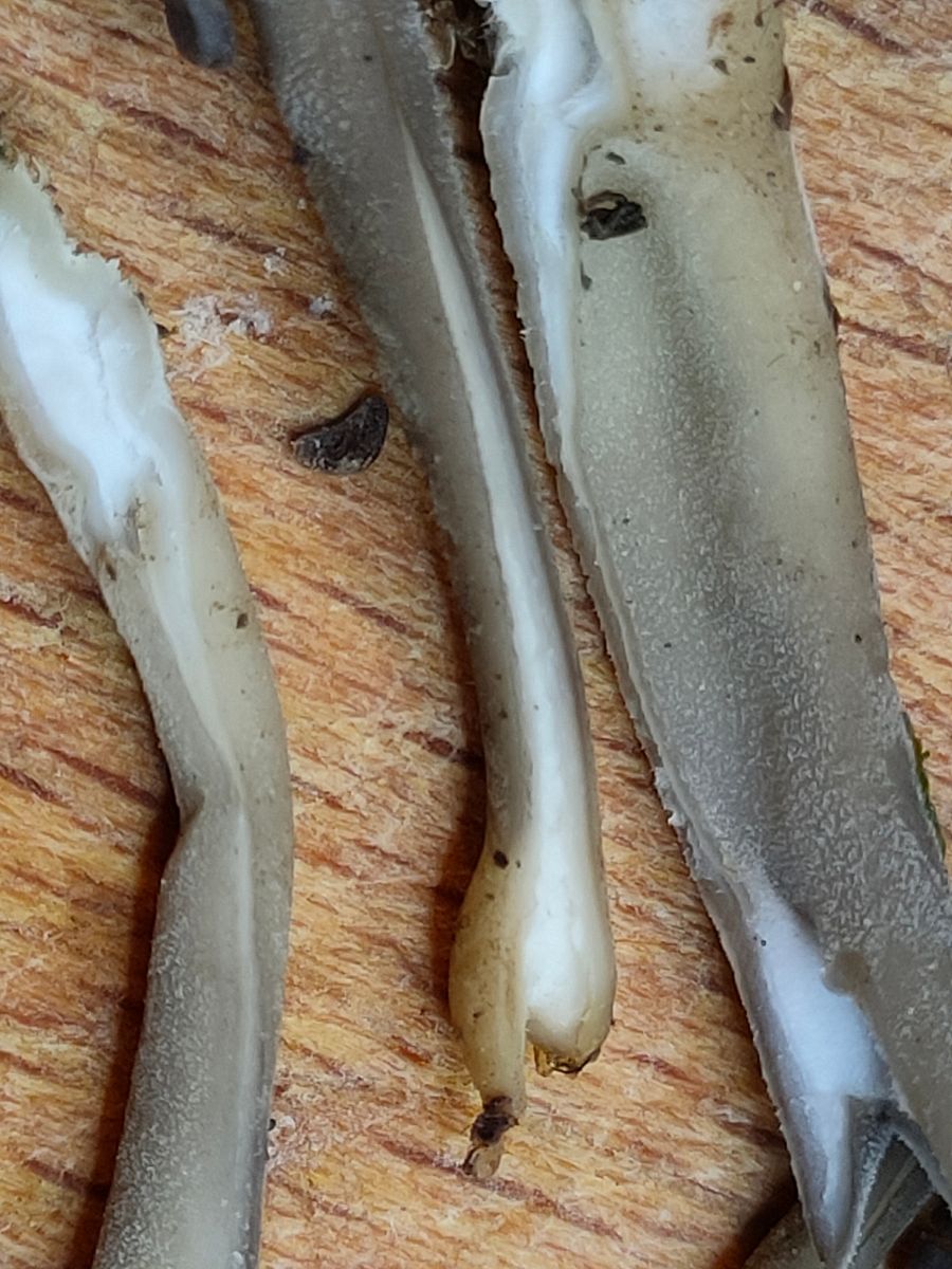 2. Eine graue/dunkle Helvalla (Sattellorchel) mit ebenfalls dunklem Stiel. Die lappige Hutstruktur ist nicht mit dem Stiel verwachsen. Der Geruch ist
