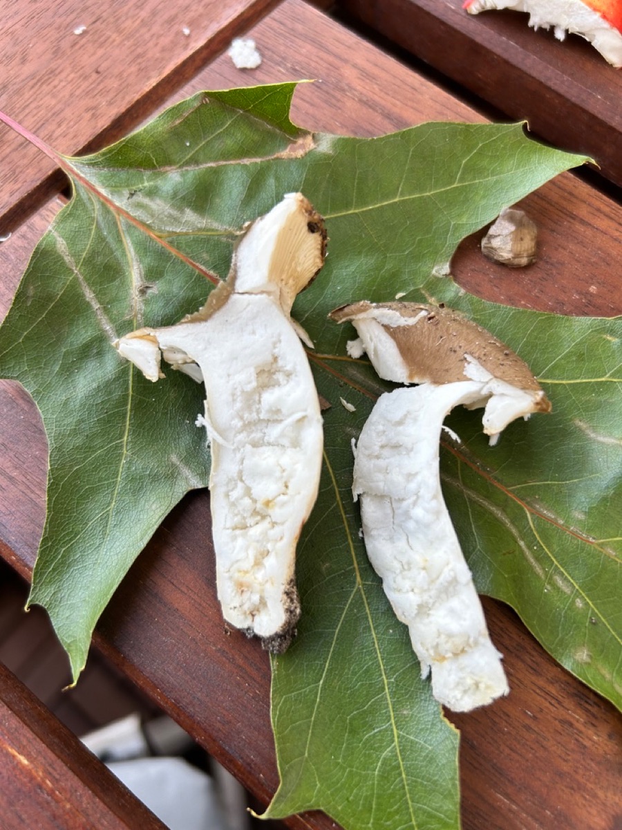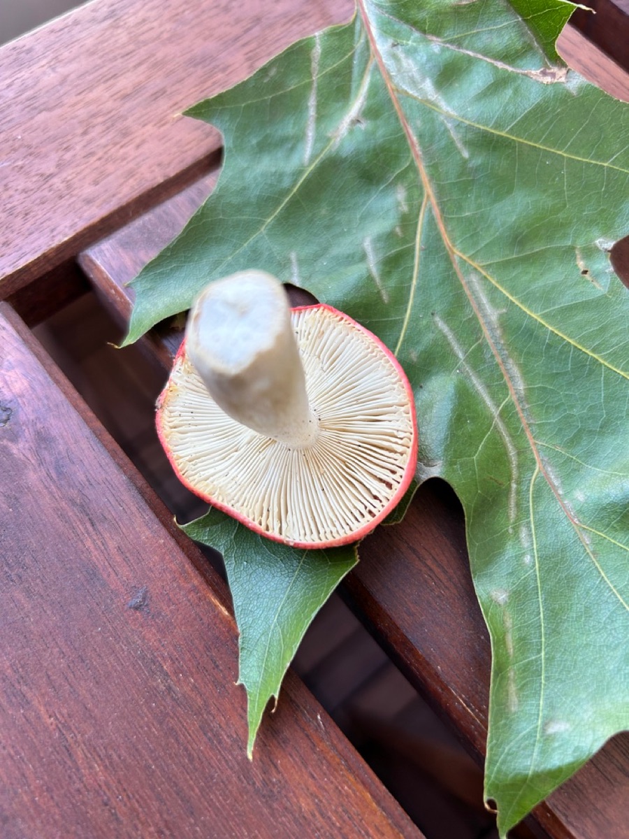 Stiel: weiß, spröde, innen bröckelig, Rostverfärbung konnte nicht provoziert werden, scheint also nicht vom Pilz selbst zu kommen // Lamellen: gerade angewachsen, spröde, in frischem Zustand noch weiß, später nachdunkelnd