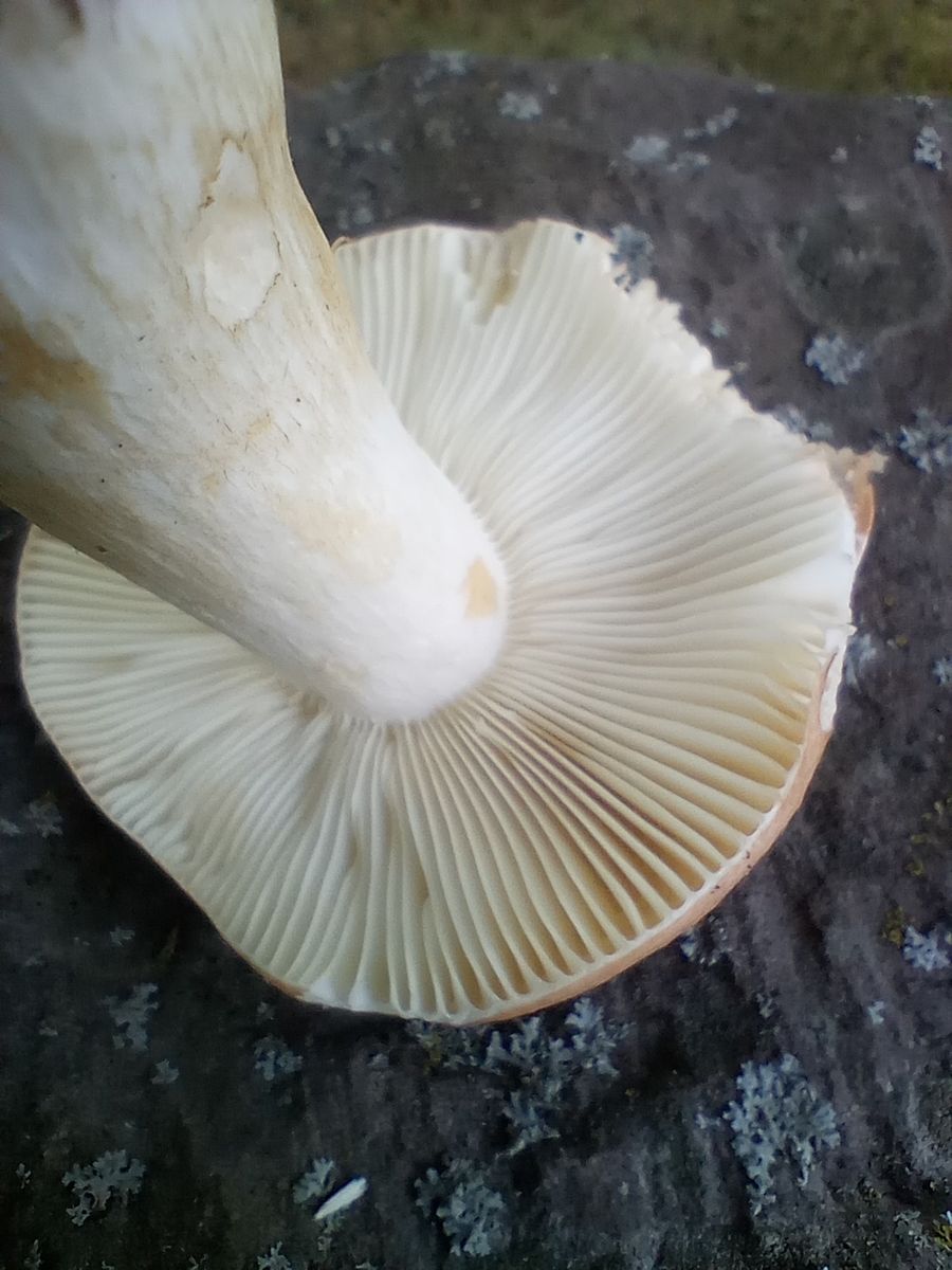 Unter Eiche; Geruch unauffällig; Geschmack mild, vielleicht ganz dezent schärflich; Hut glatt, vielleicht ganz leicht filzig; Lamellen angeheftet, kaum gegabelt, dezenter Gelbstich.