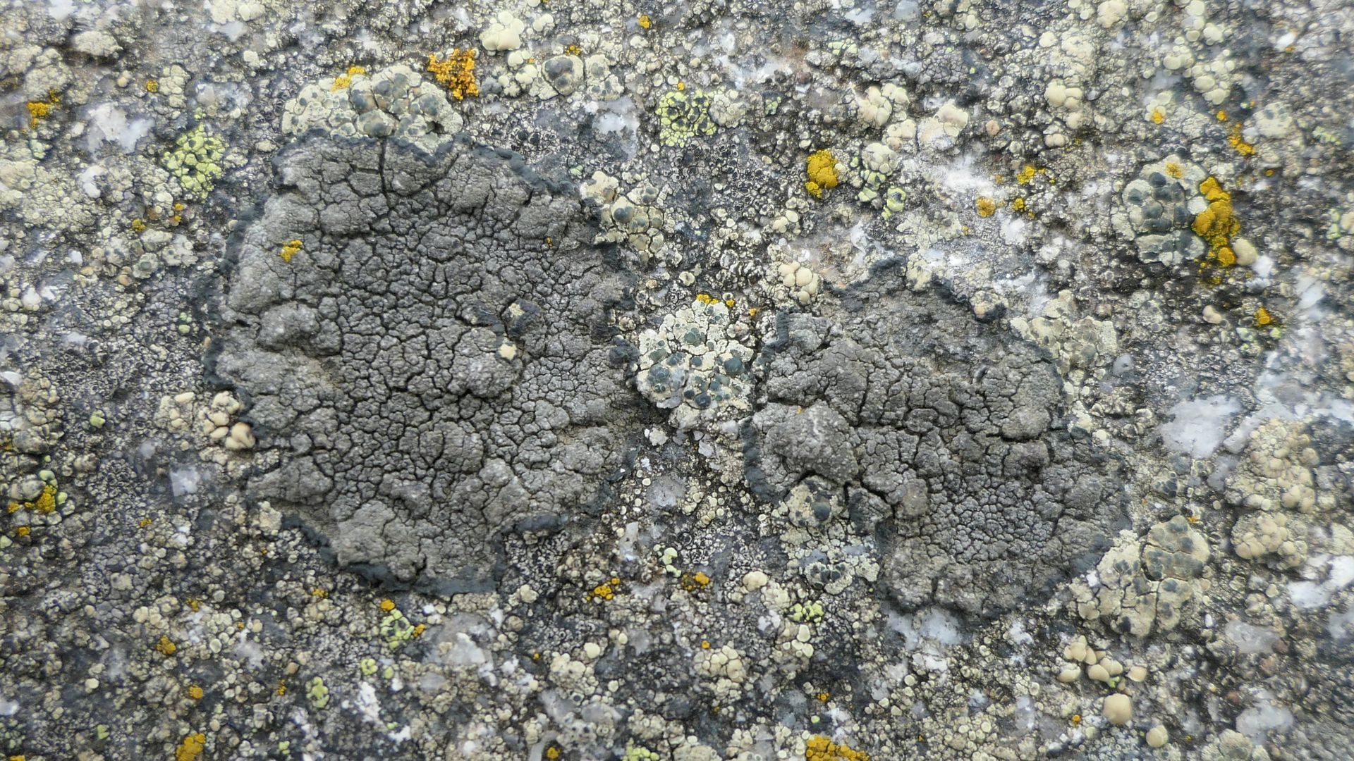 Bild 4 Zwei noch sterile Flechtenlager vermutlich der gleichen Art, sich über die hellgelbe L. intricata schiebend