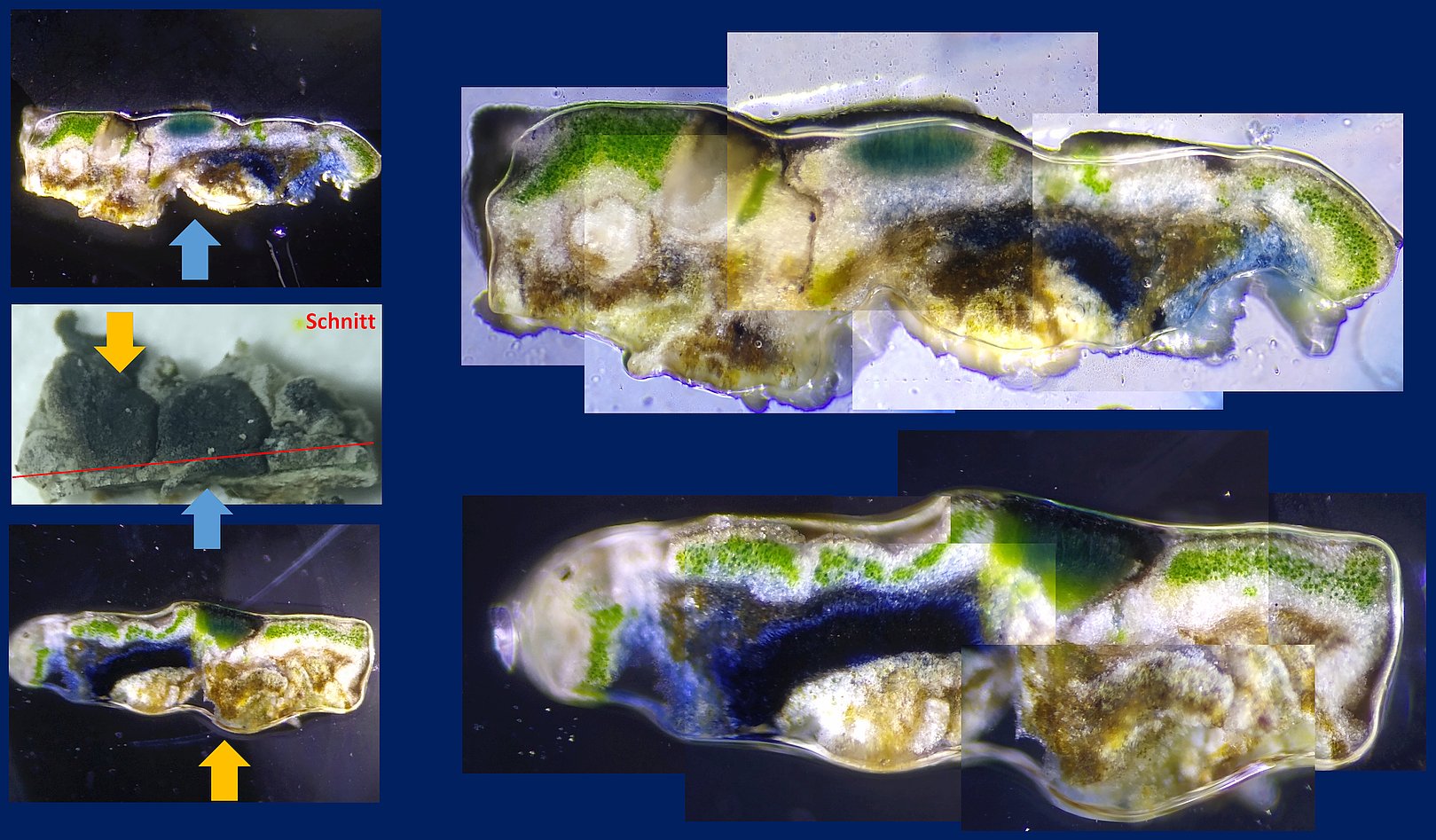 Das Hymenium (Mitte des Querschnittes in Bild 9 oben) verfärbt sich grünlich blau und das Hypothecium darunter hellblau.