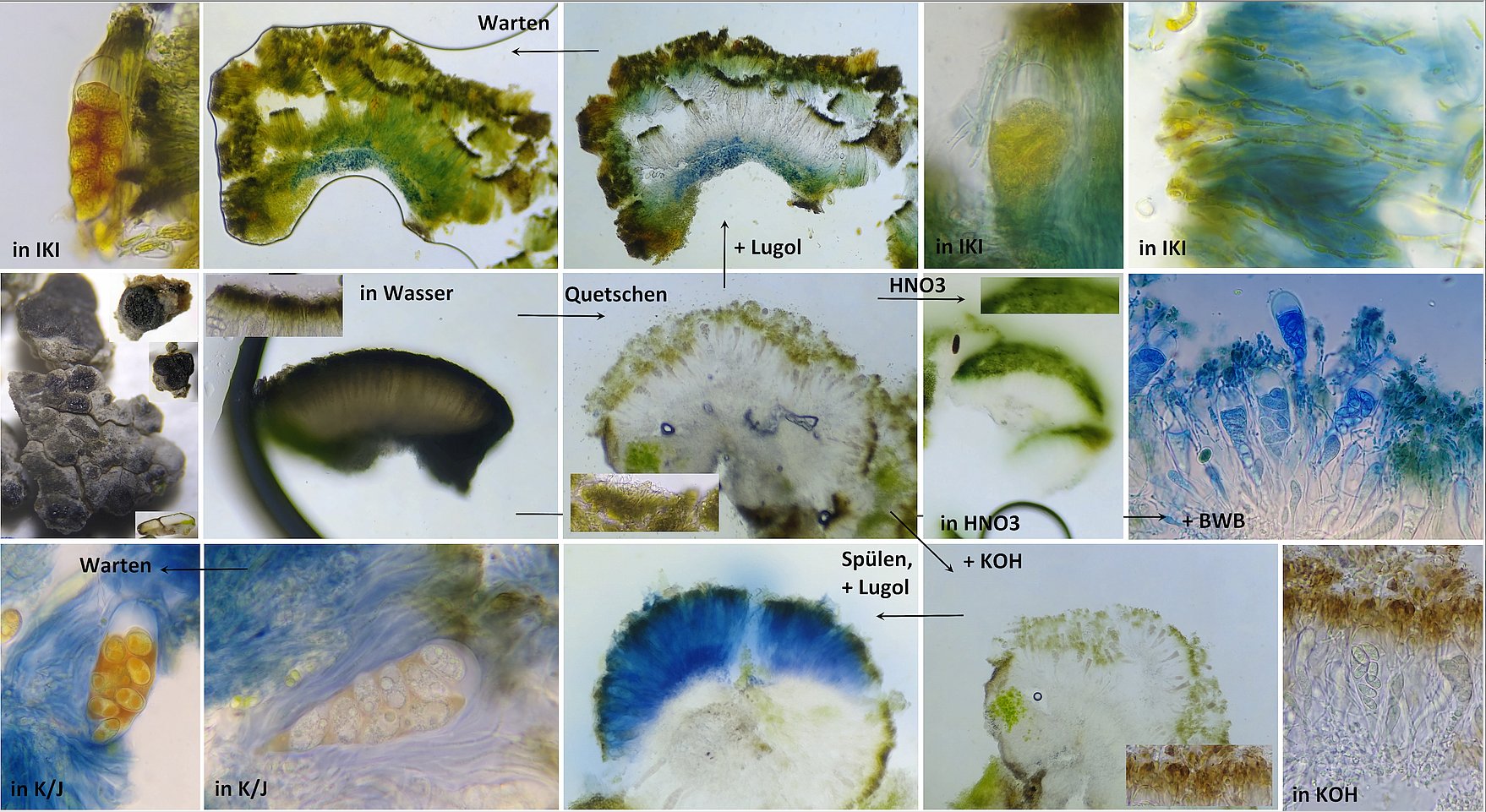 Bild 10 Collage zu Hymenium und Asci; Reaktion in J (obere Reihe), in K und K/J (untere Reihe), sowie in HNO3 und Baumwollblau (mittlere Reihe, rechts)