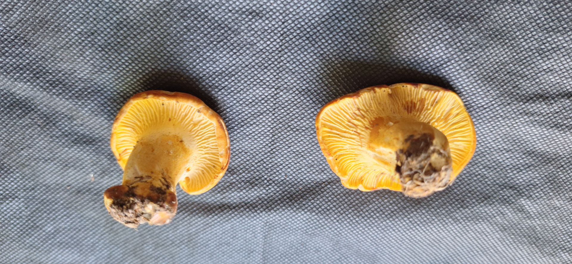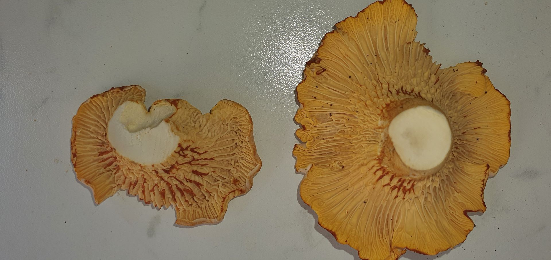 Hatte bei manchen Cibarius auch mal das Gefühl sie wären außen etwa dunkler gelb, aber das waren nur ein paar mm und nur, wenn die FK schon sichtbar am Hutrand etwas Trockenschaden hatten, das färbt sich dann ja gern mal so rotbräunlich an der Kante.
