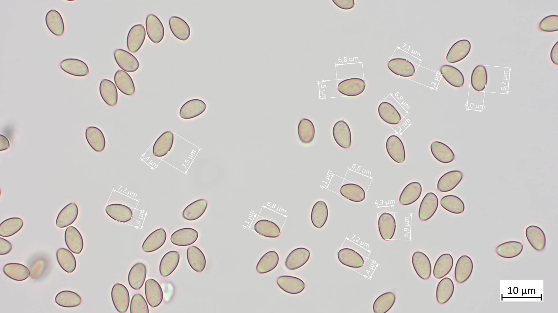 Zuerst zu den Sporen: Ich habe 34 Sporen gemessen und diese lagen bei 7.01 µm (6.5 - 7.5 µm) x 4.27 µm (4 - 4.7 µm). Soweit ich das sehe sind die Sporen glatt, dickwandig und haben einen Keimporus: