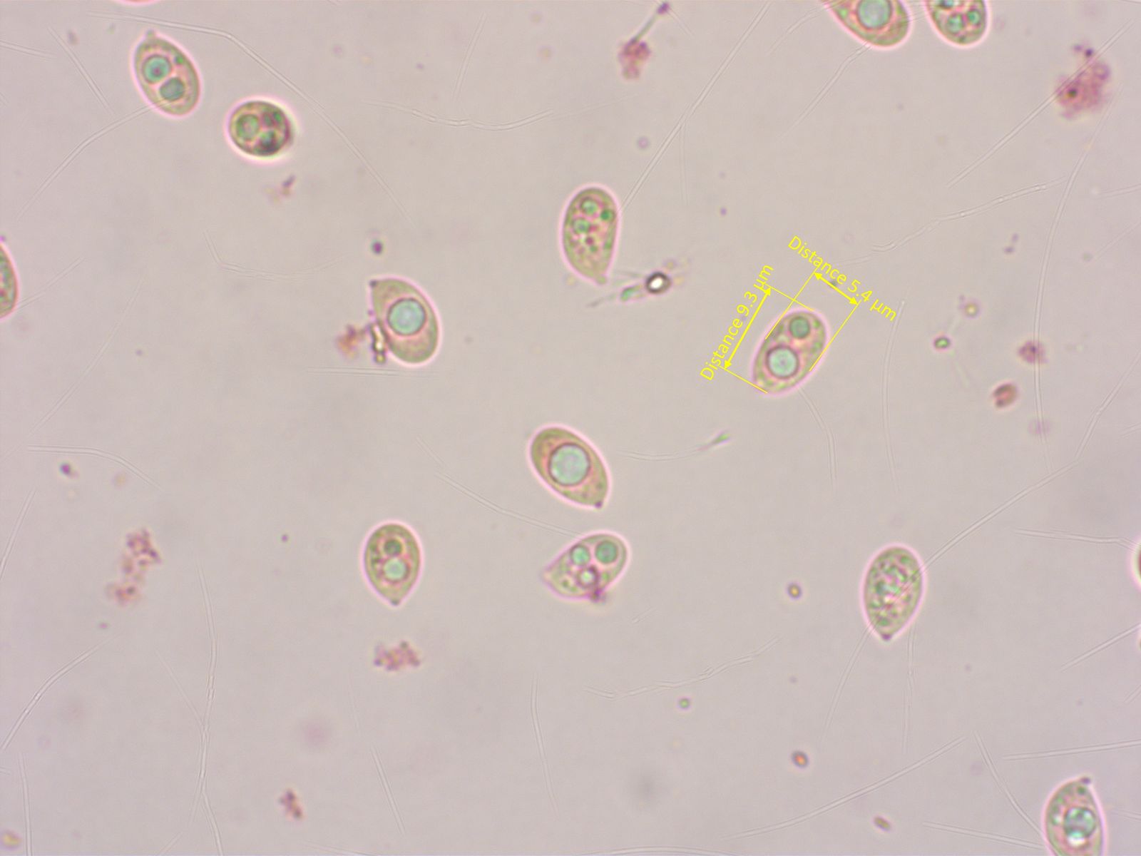 Die Sporen sind etwa 9-10 x 5-6 µm gross.