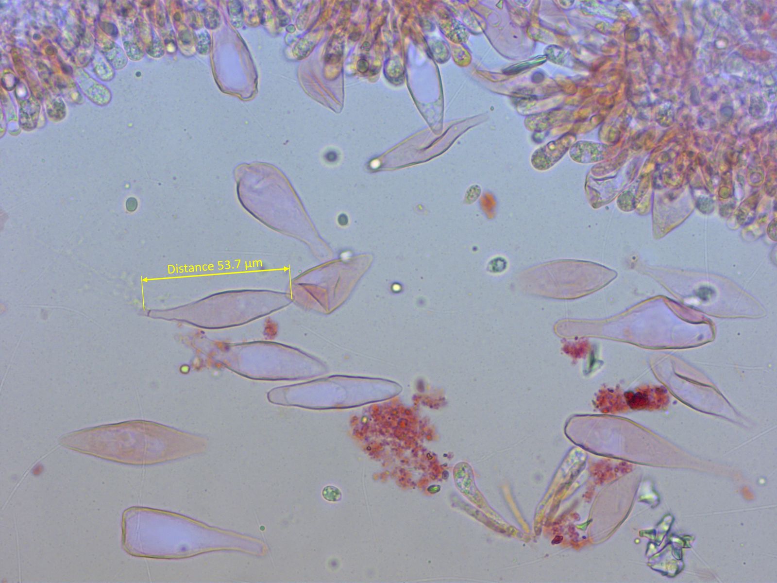 Die Cheilo- und Pleurozystiden sind recht gross, fusiform oder keulig. Sie sehen aus wie die Zystiden eines Rettichhelmlings.