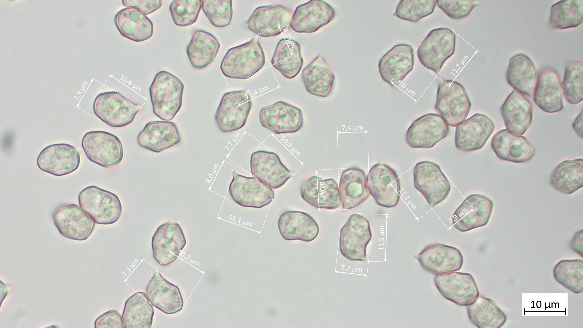 Zuerst zu den Sporen: Ich habe 31 Sporen gemessen und diese lagen bei 11 µm (9.9 - 11.9 µm) x 7.9 µm (7.3 - 8.4 µm), Q = 1.4. Auch von der Form her dürften sie passen: