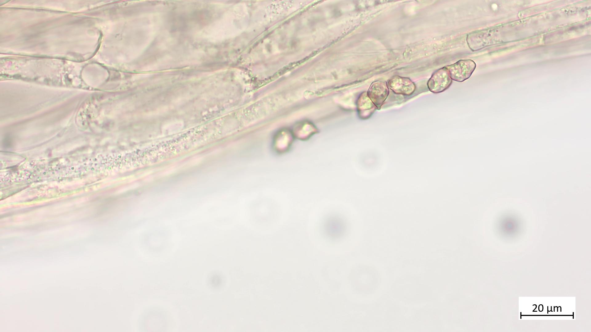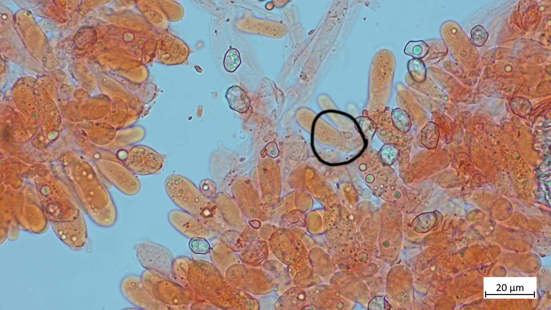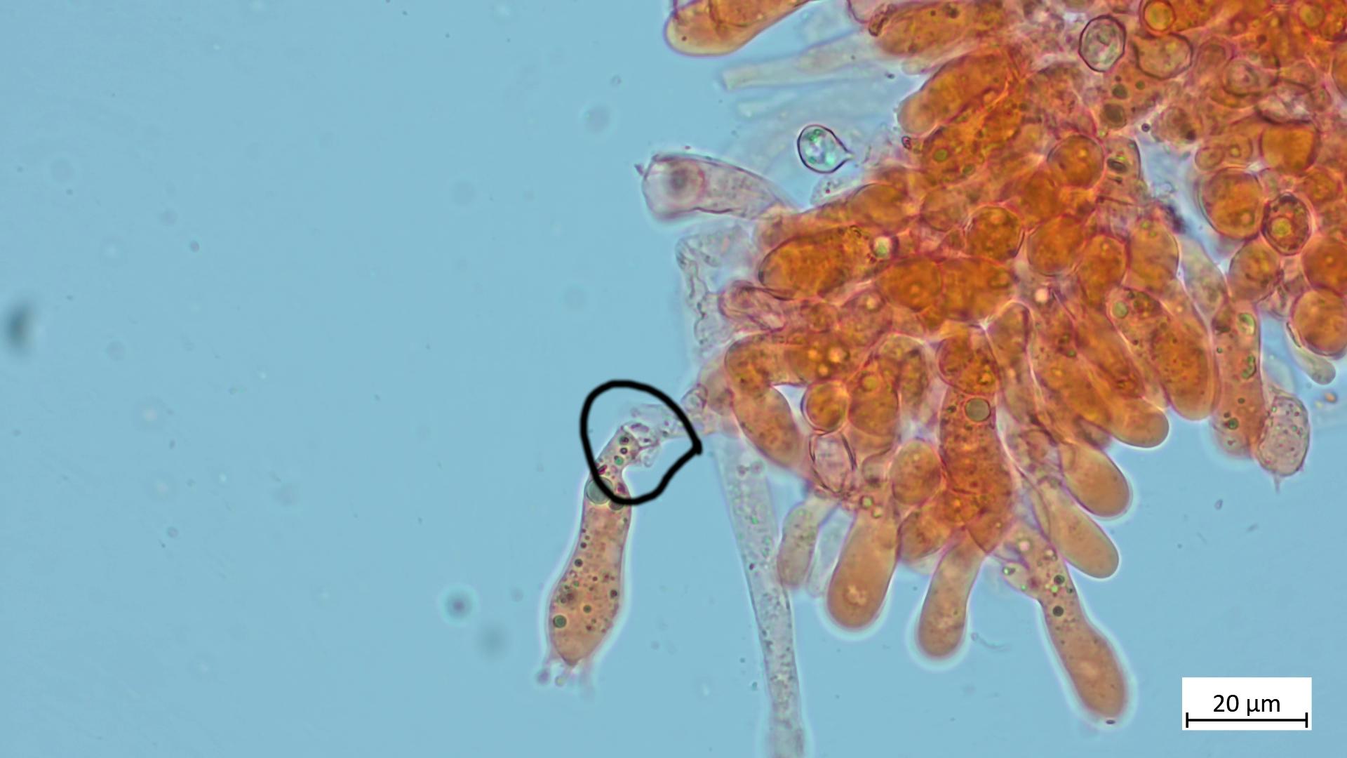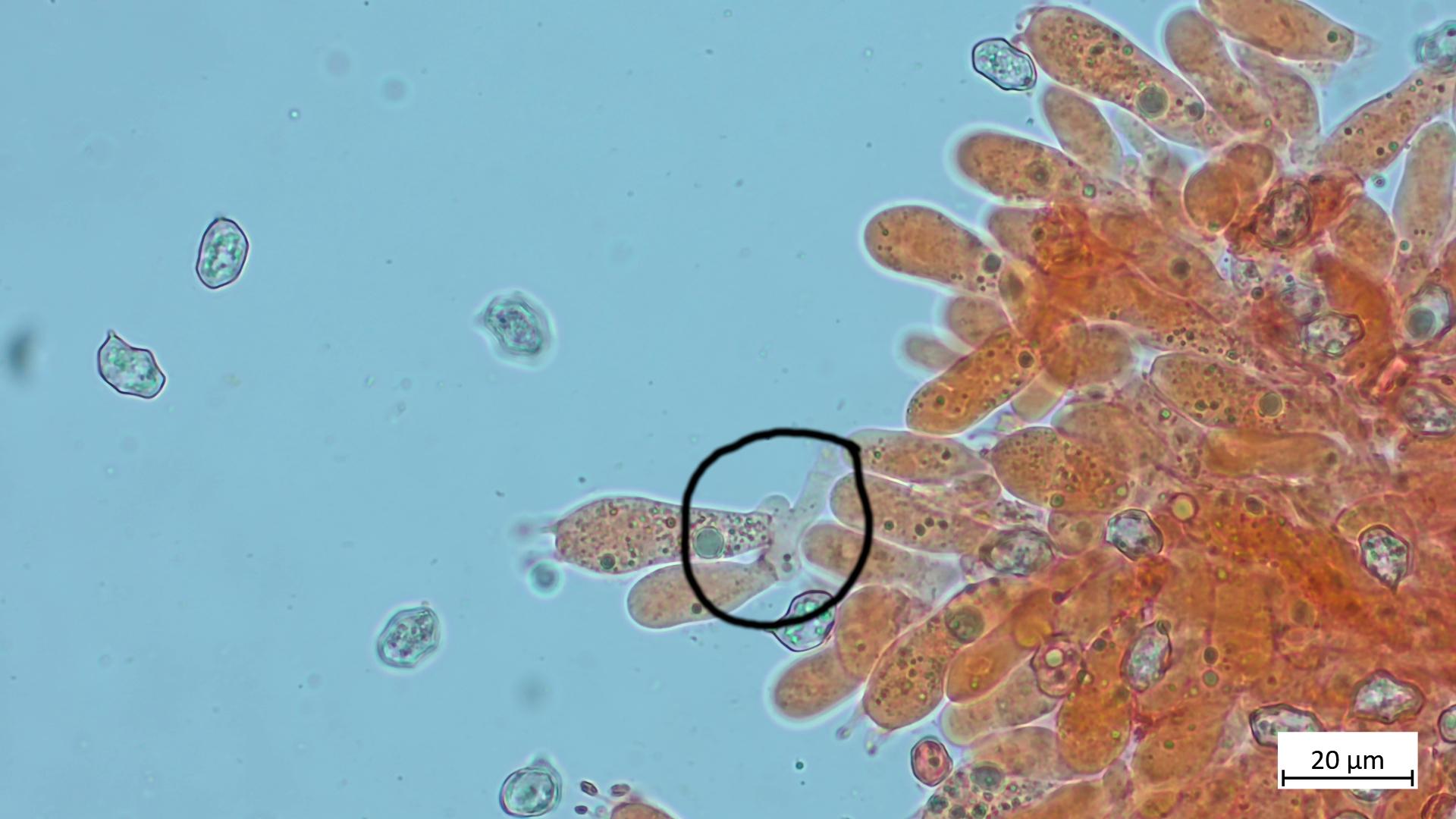 Bei den Cheilozystiden bin ich mir nicht sicher. In einigen Quellen steht, dass keine vorhanden sind. Im Buch FE Entoloma steht: "cystidia absent or scattered among basidia, but strongly protruding from hymenium". Ich weiss beim Mikroskopieren oft noch nicht genau, was ich da gerade sehe. :) Das rot eingekreiste, unter der Basidie sind ja keine Cheilos, oder?