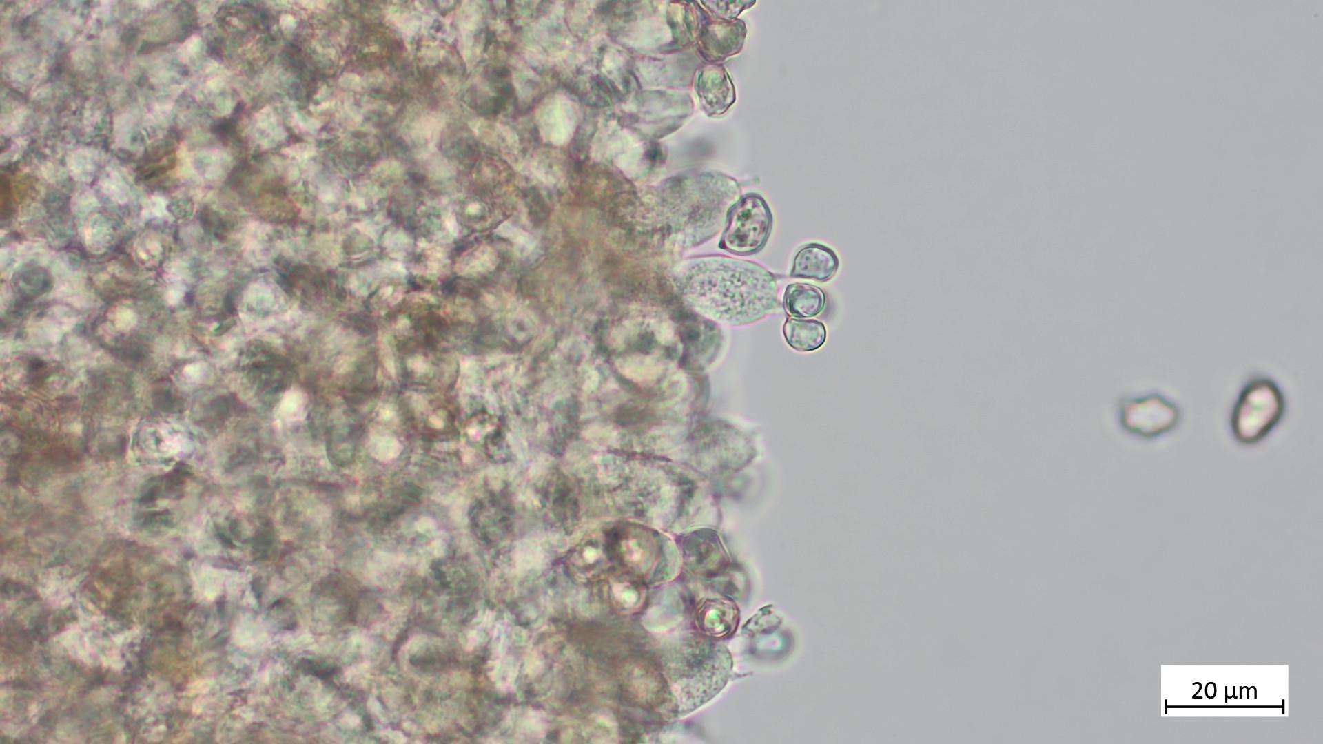 Zuerst zu den Sporen: Ich habe 31 Sporen gemessen und diese lagen bei 11 µm (9.9 - 11.9 µm) x 7.9 µm (7.3 - 8.4 µm), Q = 1.4. Auch von der Form her dürften sie passen: